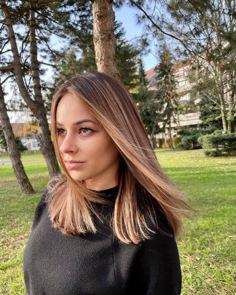 Bright and fresh, this look takes medium brown hair and infuses it with light caramel highlights. The straight styling shows off the contrast beautifully, giving the hair a sleek, modern finish. It’s a clean and polished approach, perfect for women who want sophistication with a little sparkle.