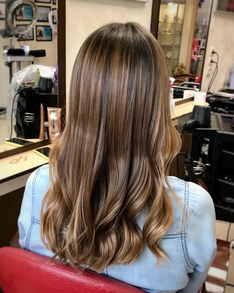 This style is perfect for women with long, thick hair who want to add lightness without committing to high-contrast highlights. The caramel tones keep it fresh and modern, while layered waves give bounce and movement. Use a curling wand and finger-comb the waves for a softer, more natural look.