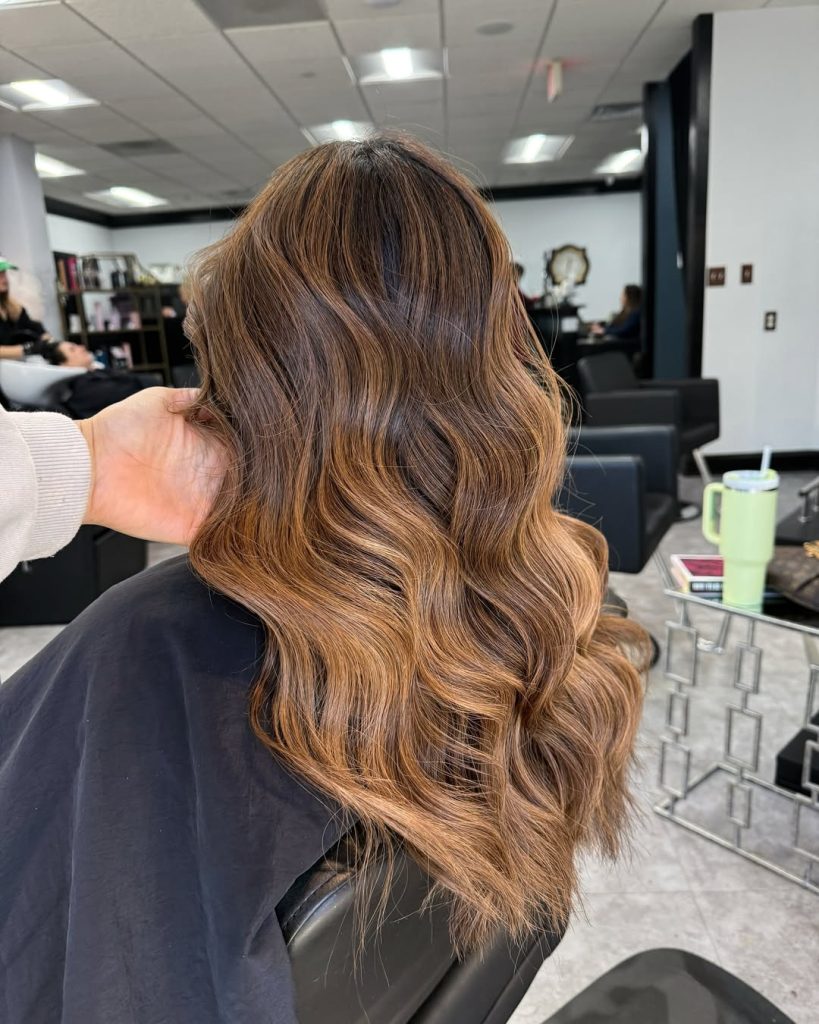 Bright, youthful, and endlessly chic, this style blends light brown tones with caramel balayage waves. The highlights flow naturally from the roots to the ends, creating a seamless, sun-kissed finish. It’s the kind of hair that looks equally good styled for brunch or left loose for an everyday glow.