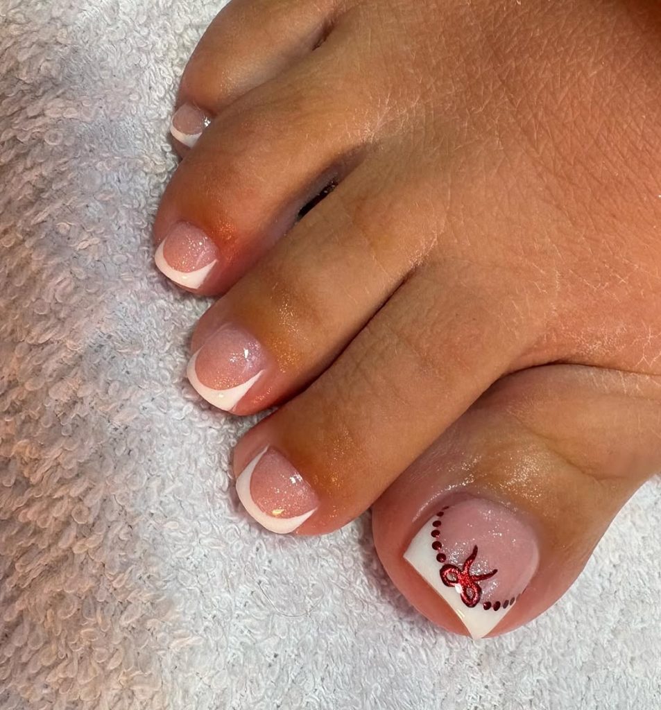 Sometimes, the most charming holiday looks are also the most simple. This French tip with a delicate shimmer is topped off with a tiny red bow on the big toe, making it look like a beautifully wrapped gift. The design feels feminine and polished, giving off that classy yet playful holiday energy without going overboard.
