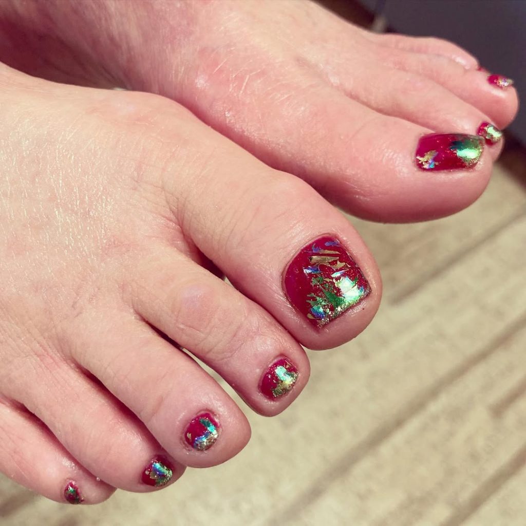 13. Shimmering Red and Green Foil Christmas Toenails 2025