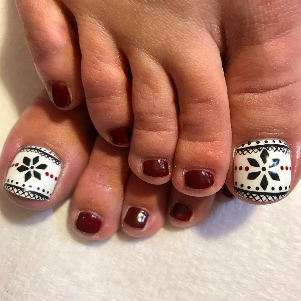 Inspired by cozy sweaters, these toenails bring Nordic-style patterns into festive polish. The deep burgundy base contrasts beautifully with the black-and-white art, creating a look that’s both warm and stylish. It’s the kind of design that feels like curling up with cocoa by the fire.