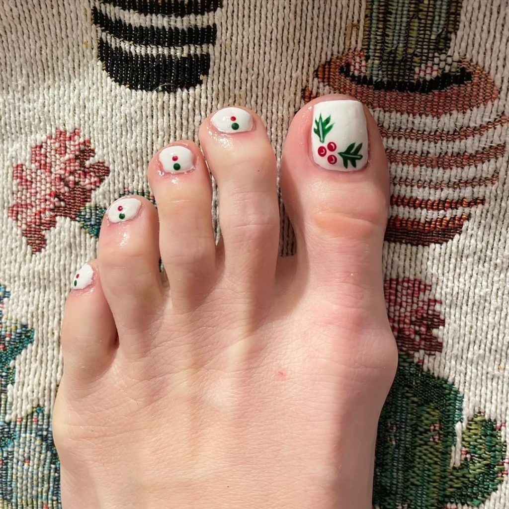 Sometimes less is more, and these minimalist sprig designs are proof that Christmas toenails don’t always have to scream for attention. The clear pink base feels fresh and natural, while tiny green leaves with red berries add a festive but subtle detail. Paired with thin white tips, it’s a classy nod to French polish that still embraces the season. This is the kind of design that feels chic and elevated.