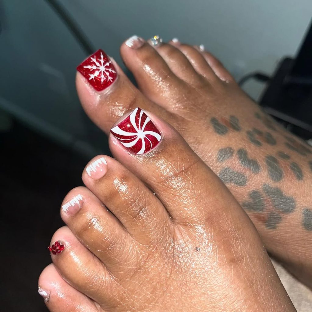 Peppermint swirls and snowflakes are holiday classics, and this design combines both with a festive red base. The white art pops beautifully against the bold polish, giving your toes a playful candy-inspired vibe. It’s fun, cheerful, and instantly recognizable as a Christmas look.