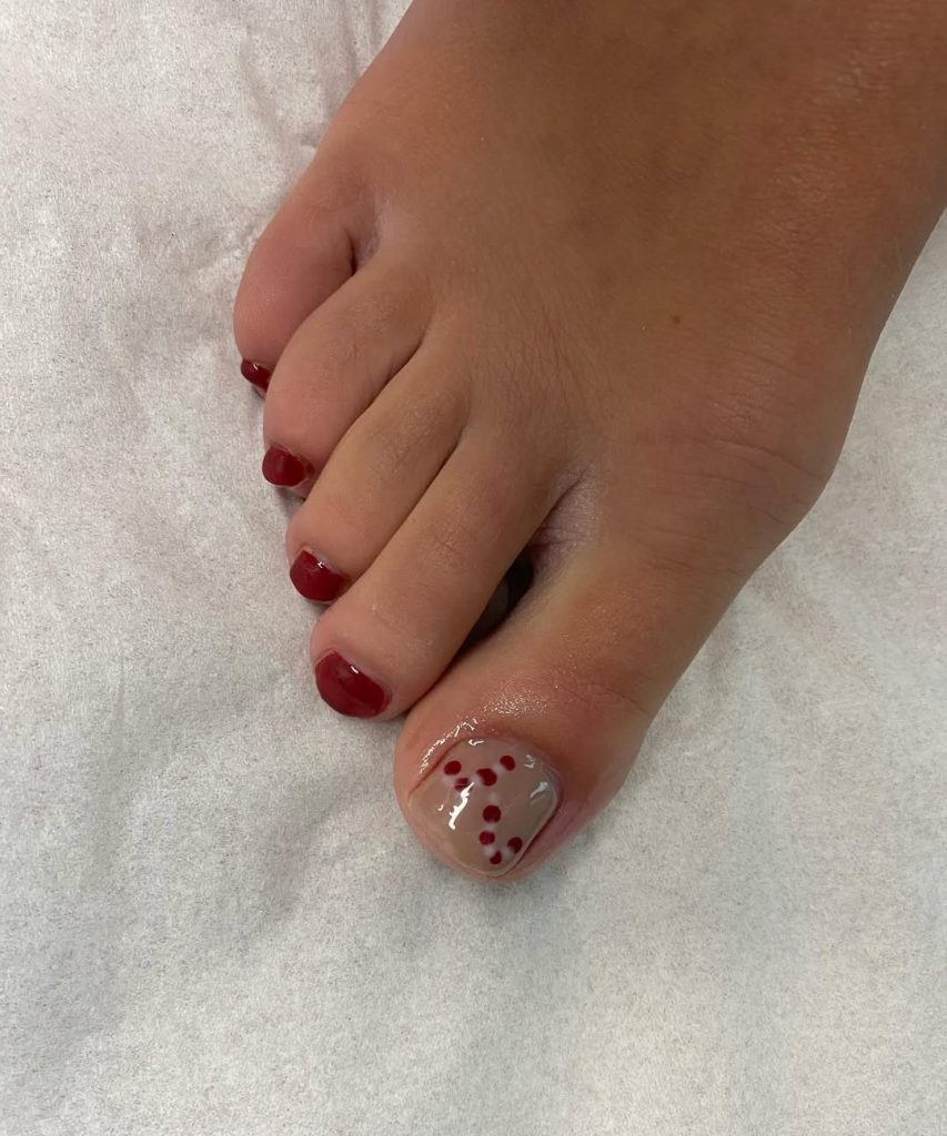 A soft nude base paired with tiny red dots shaped like a cross makes this design quietly festive. The rest of the toes are polished in a glossy red, giving just enough seasonal charm without being too bold. It’s understated, modern, and perfect for women who love subtle inspo during the holidays.