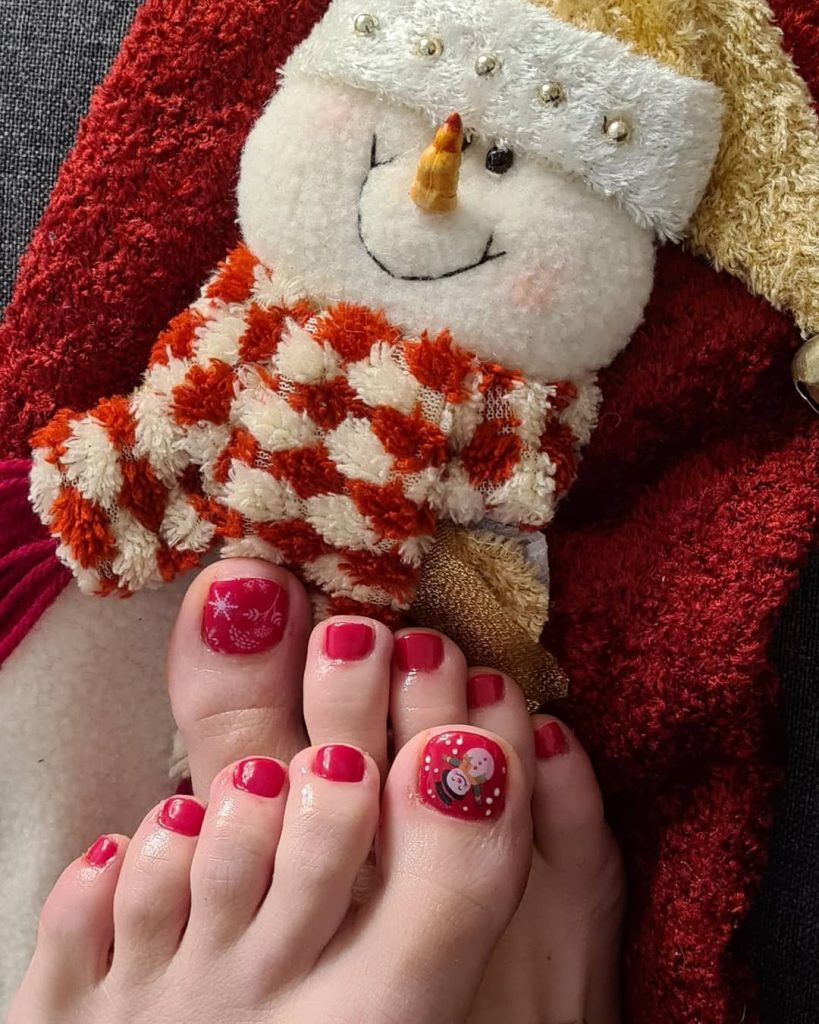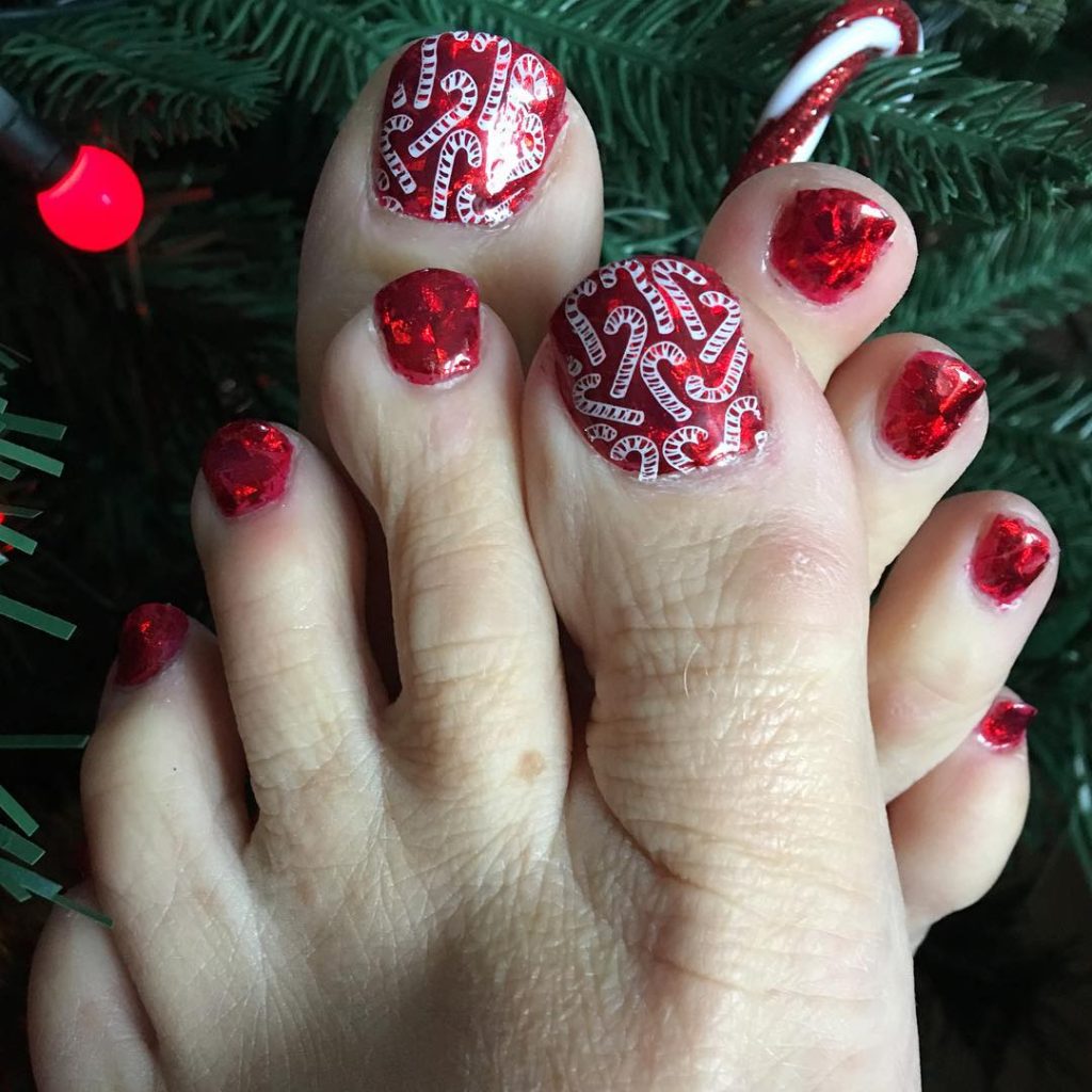 Bright red nails sprinkled with candy cane art create a playful and nostalgic Christmas vibe. This design feels cheerful and sweet, almost like holiday wrapping paper for your toes. It’s the kind of festive polish that can make you smile every time you look down.