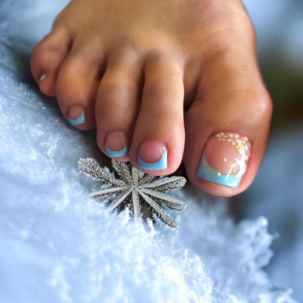 Soft, icy blue tips paired with delicate white snowflakes make this look feel like a frosty winter morning. The clean base allows the color to pop without feeling overwhelming, while the subtle art designs on the big toe add just the right seasonal detail. It’s chic, refreshing, and the kind of inspo that reminds you of twinkling lights against freshly fallen snow.