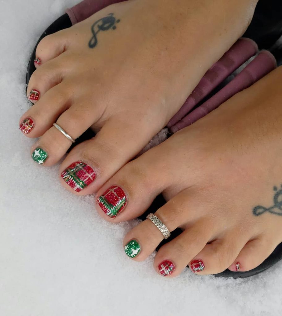Bold and playful, this design is a joyful mix of green, red, yellow, and glitter—complete with snowflakes and plaid art. It feels almost like unwrapping gifts on Christmas morning, with each toe carrying its own fun little surprise. The variation of patterns keeps the look lively and festive, perfect for anyone who loves a bit of whimsy in their style.