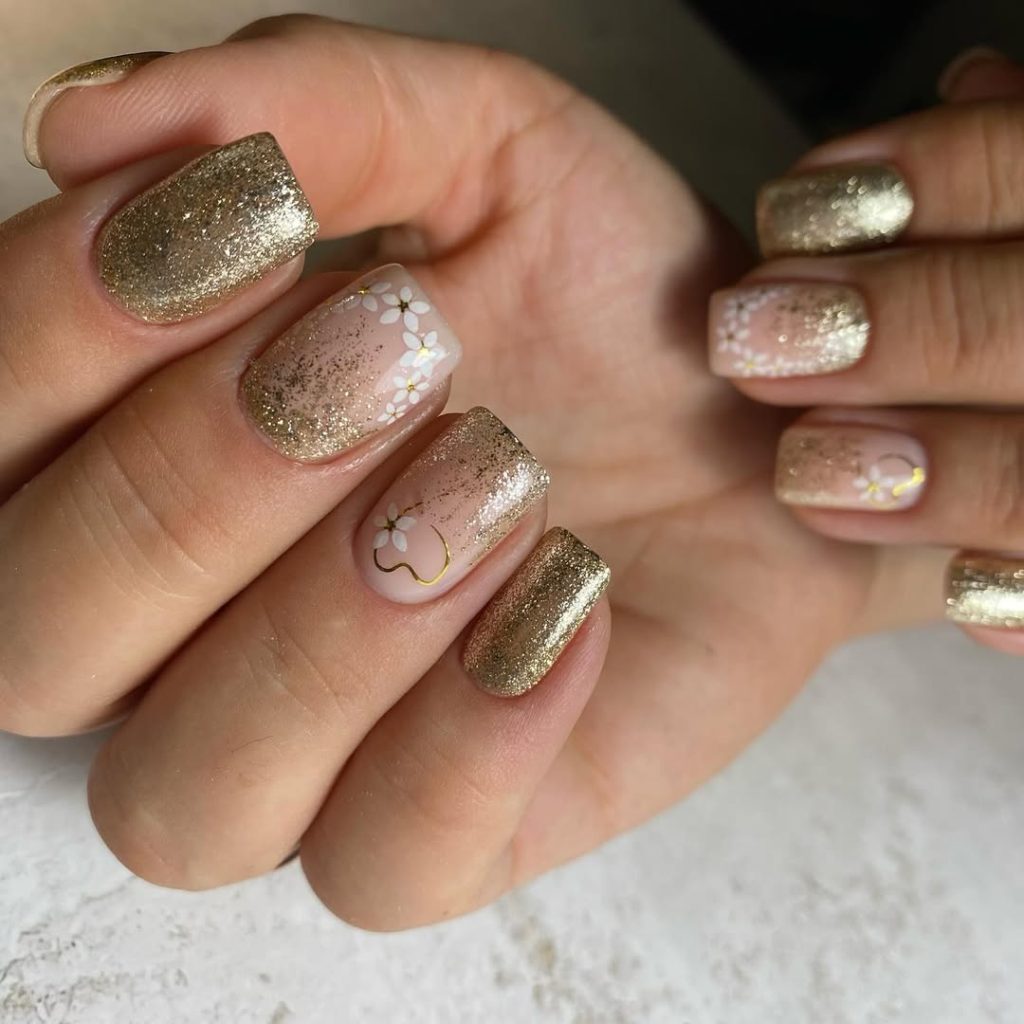 This manicure feels like quiet luxury—the kind you notice when the light hits your hands just right. The soft nude base melts into shimmering champagne gold, with delicate white florals that add a gentle, almost romantic art touch. It’s refined without feeling precious, and there’s something very calming about the balance between sparkle and softness. This design looks great with a coffee mug or dressed up for a night out.