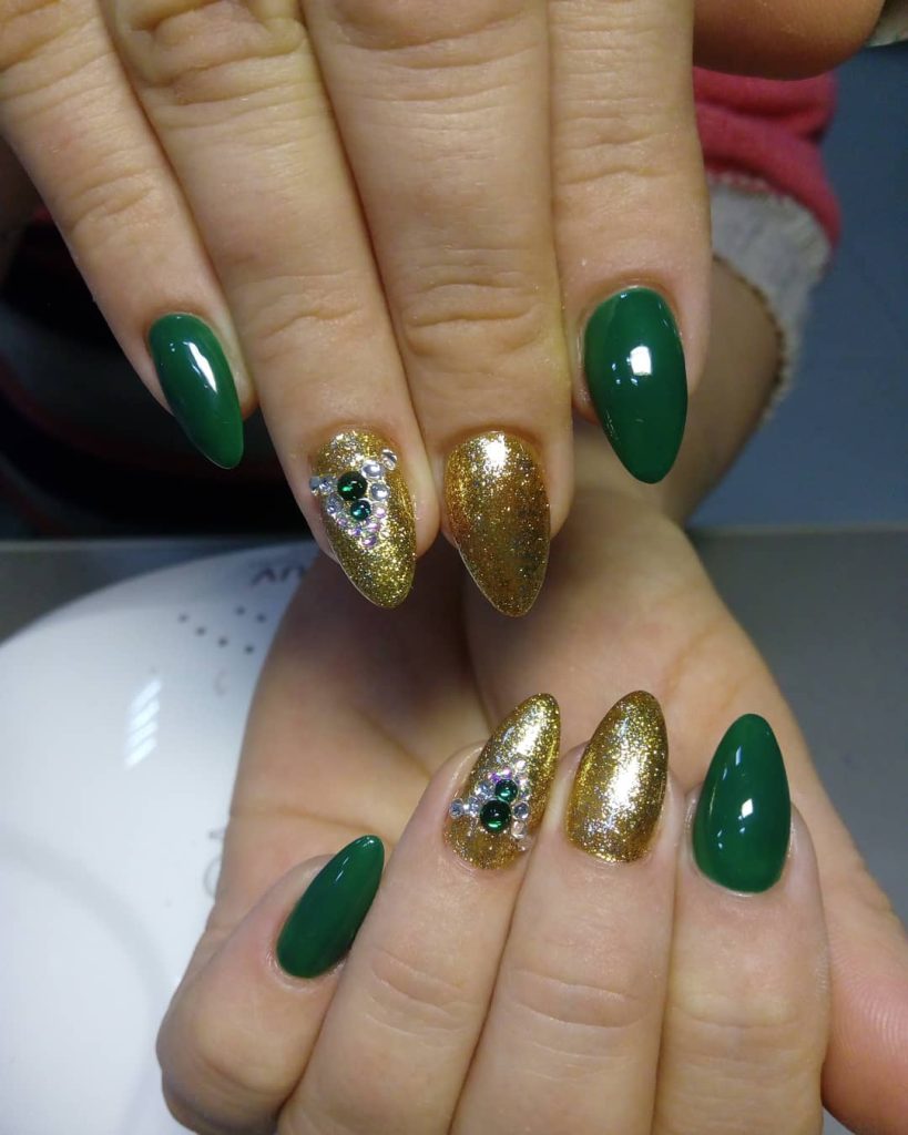 10. Green And Gold Jewel Accent Nails