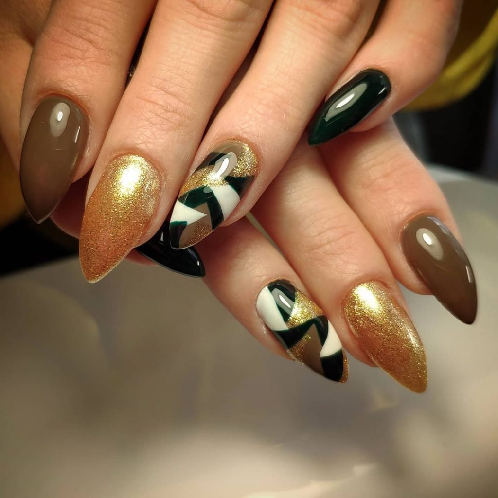 A design of this color feels grounded and is certainly impressive. Brown and gold elicit a warm and deep feeling and, paired with some geometric designs, showcase a more modern and stylized look. It has a certain degree of impressiveness and is certainly well thought out. This design is ideal for individuals seeking to instill a strong sense of personal style in their nail art.