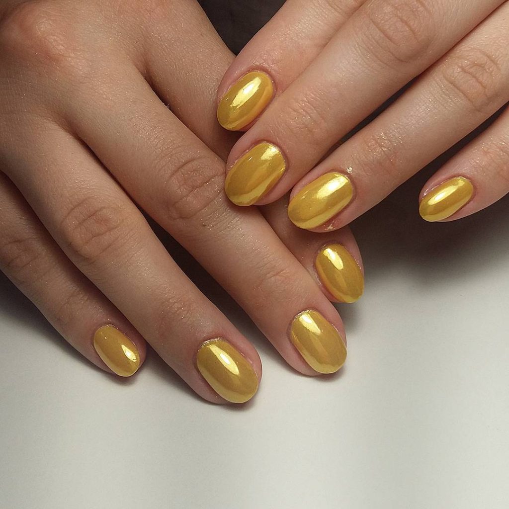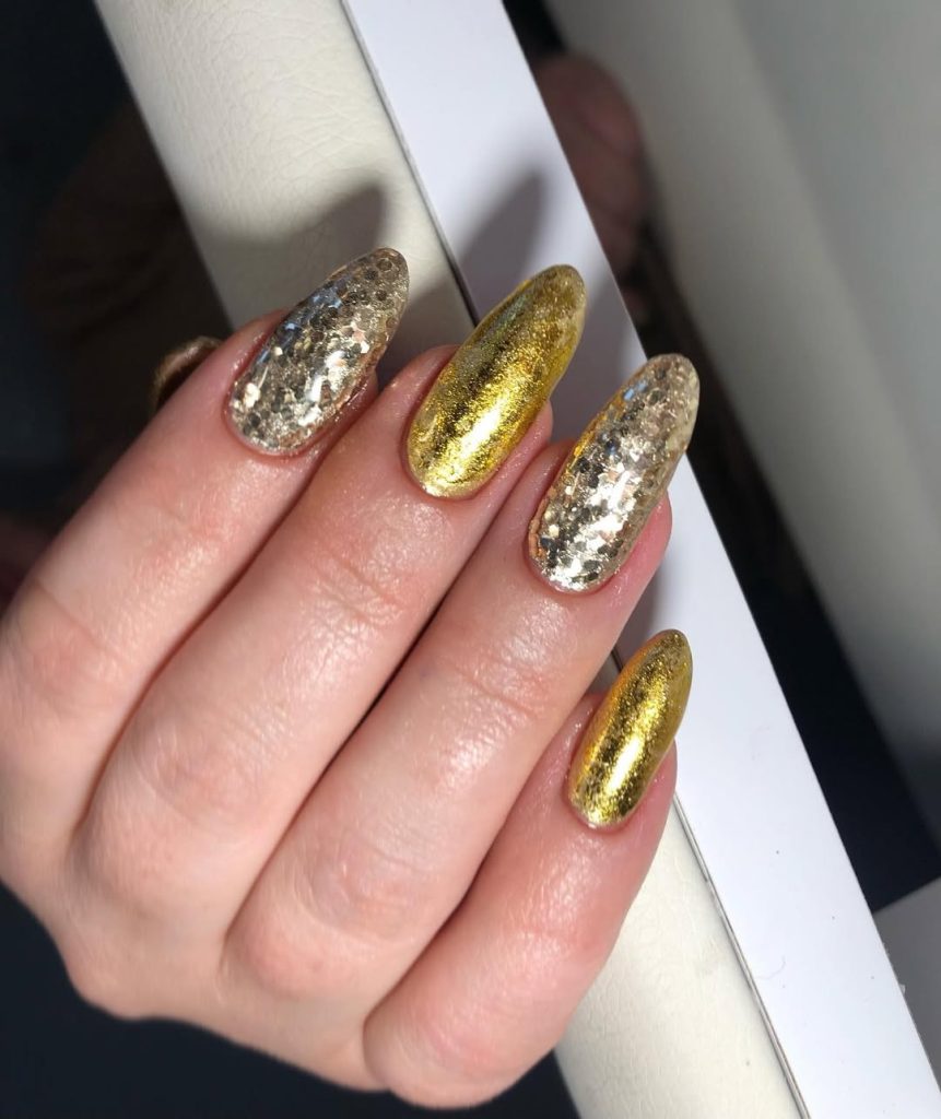 This style stands out because of its individuality. Every single nail is different from one another, giving off a unique, handcrafted vibe. If you like nails that have character, it’s a wonderful choice. This type of gold polish is also nice on shorter nails, too, making it a good pick for anyone looking for bold art without a lot of added design.