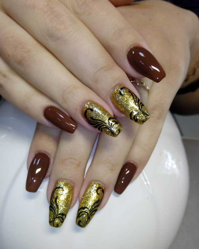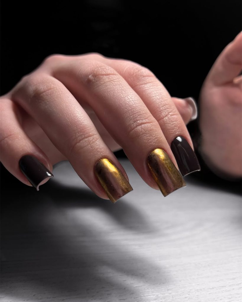 This style gives off a strong, self-assured vibe and works well for anyone who wants something different from pinks and nudes. Square shapes keep it structured, and a gel finish helps maintain that glossy depth. Brown and gold combinations feel especially relevant for 2026, offering a sophisticated alternative to classic red and black nails.