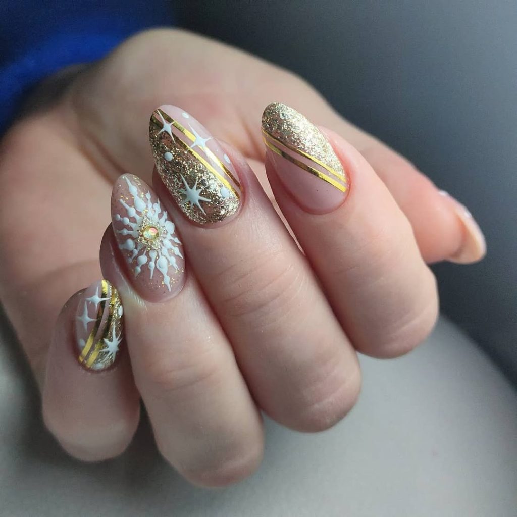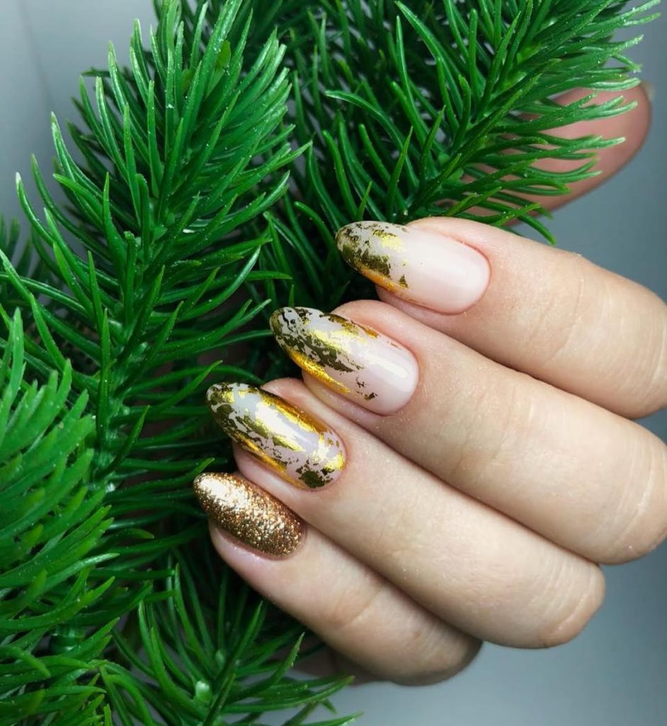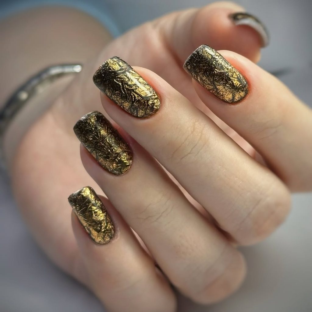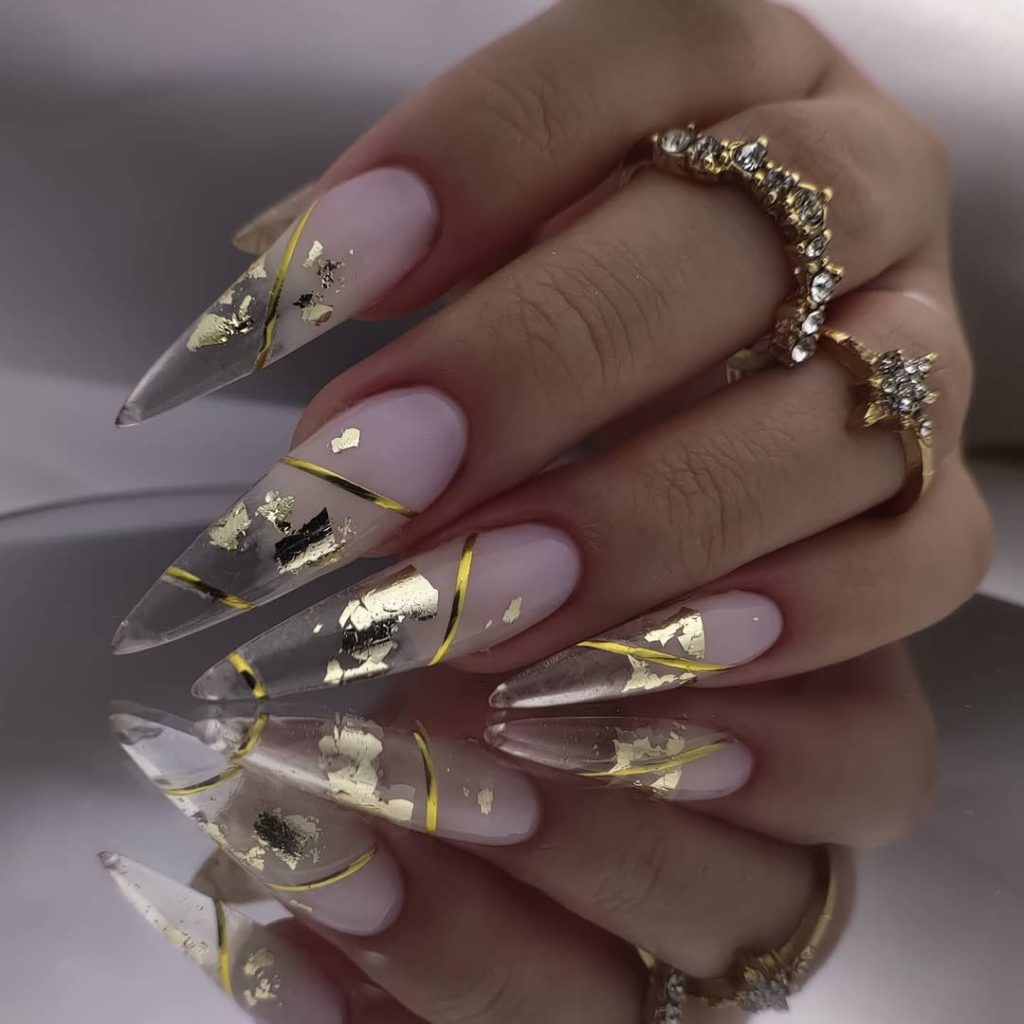If you’re someone who prefers a lighter look with artistic detail, this style is a beautiful option. It works especially well with longer nail shapes, where the foil has space to shine without feeling crowded. Nude and gold combinations like this are incredibly flattering and low-maintenance, making them perfect for women who want something special that still fits into everyday life.