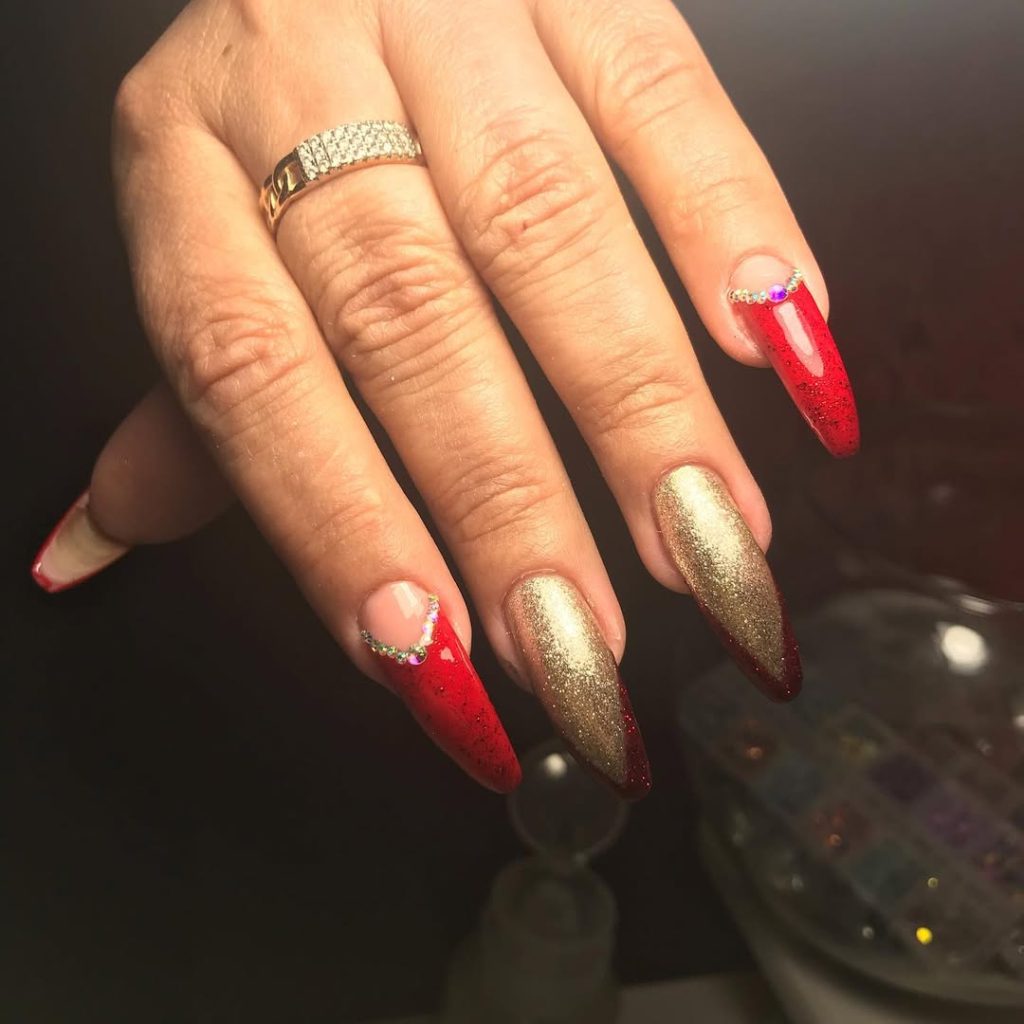 These nails feel bold, glamorous, and full of personality. The red-to-gold gradient creates movement and depth, while the small jewel accents add a touch of sparkle that feels festive without being overwhelming. It’s the kind of manicure that feels celebratory, like you’re dressing up your hands for something special.