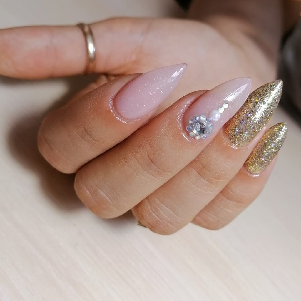 21. Soft Nude Gold Crystal Almond Nails