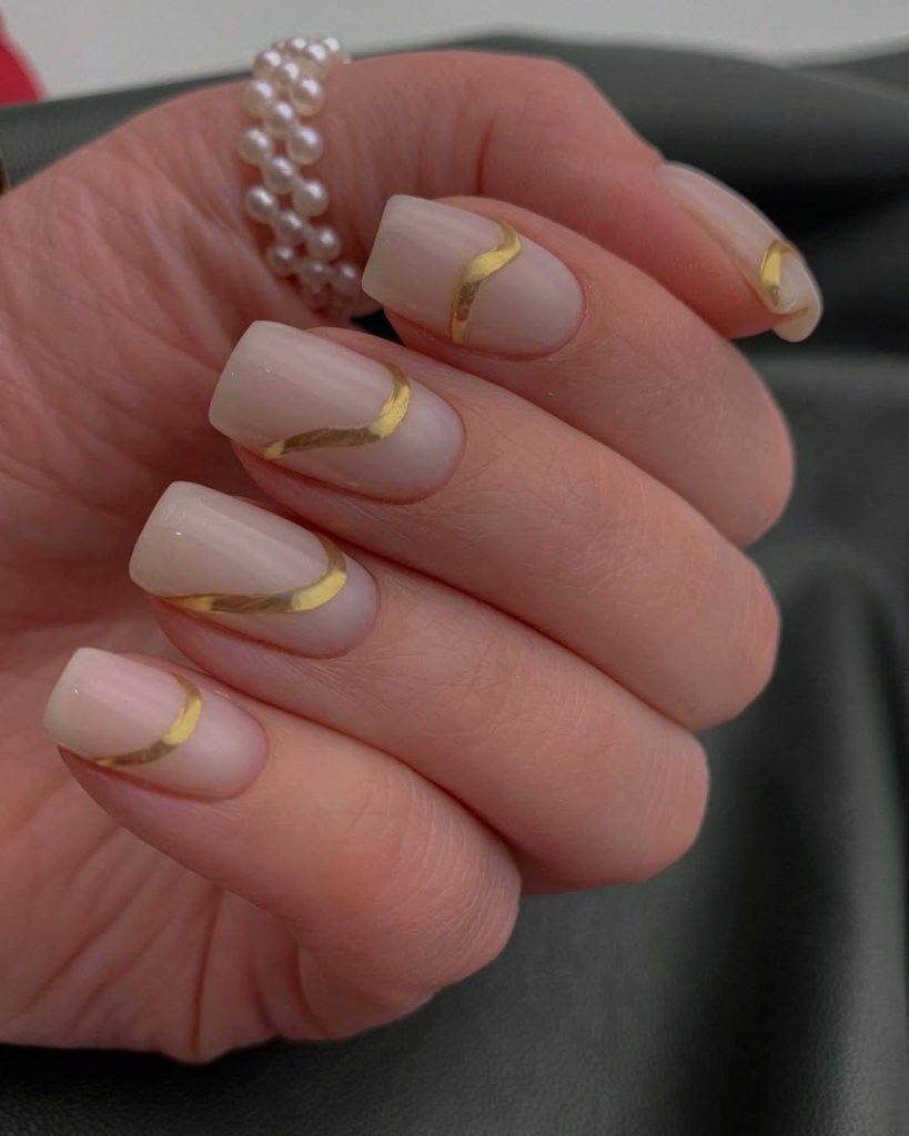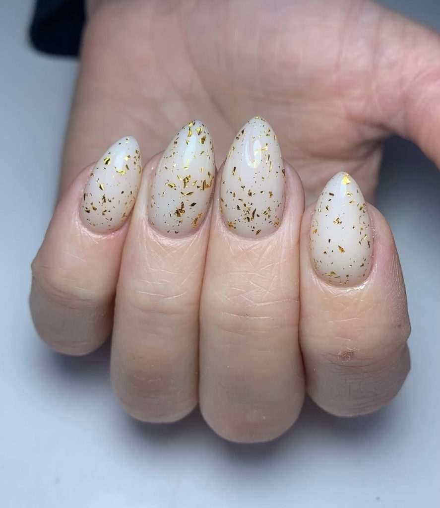 23. Creamy Nude Nails With Gold Foil Details