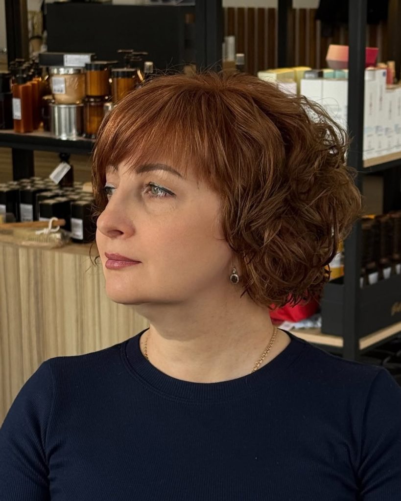The curly short bob with bangs is wonderfully sassy. The texture contributes to the playfulness while the bangs gently frame the face, producing a look that is modern and friendly at the same time. It’s chic yet not mostrando effort, the kind of haircut that feels stylish and effortless all at once.