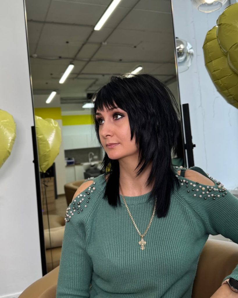 This edgy long shag with bangs has a rock-chic attitude that instantly commands attention. The sharp layers, choppy texture, and straight fringe create a bold, contemporary shape that’s perfect for expressing individuality. It’s daring yet wearable, adding personality to your everyday look.