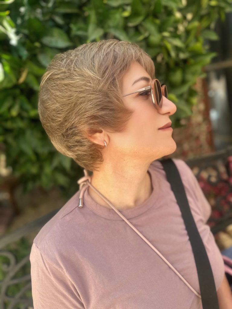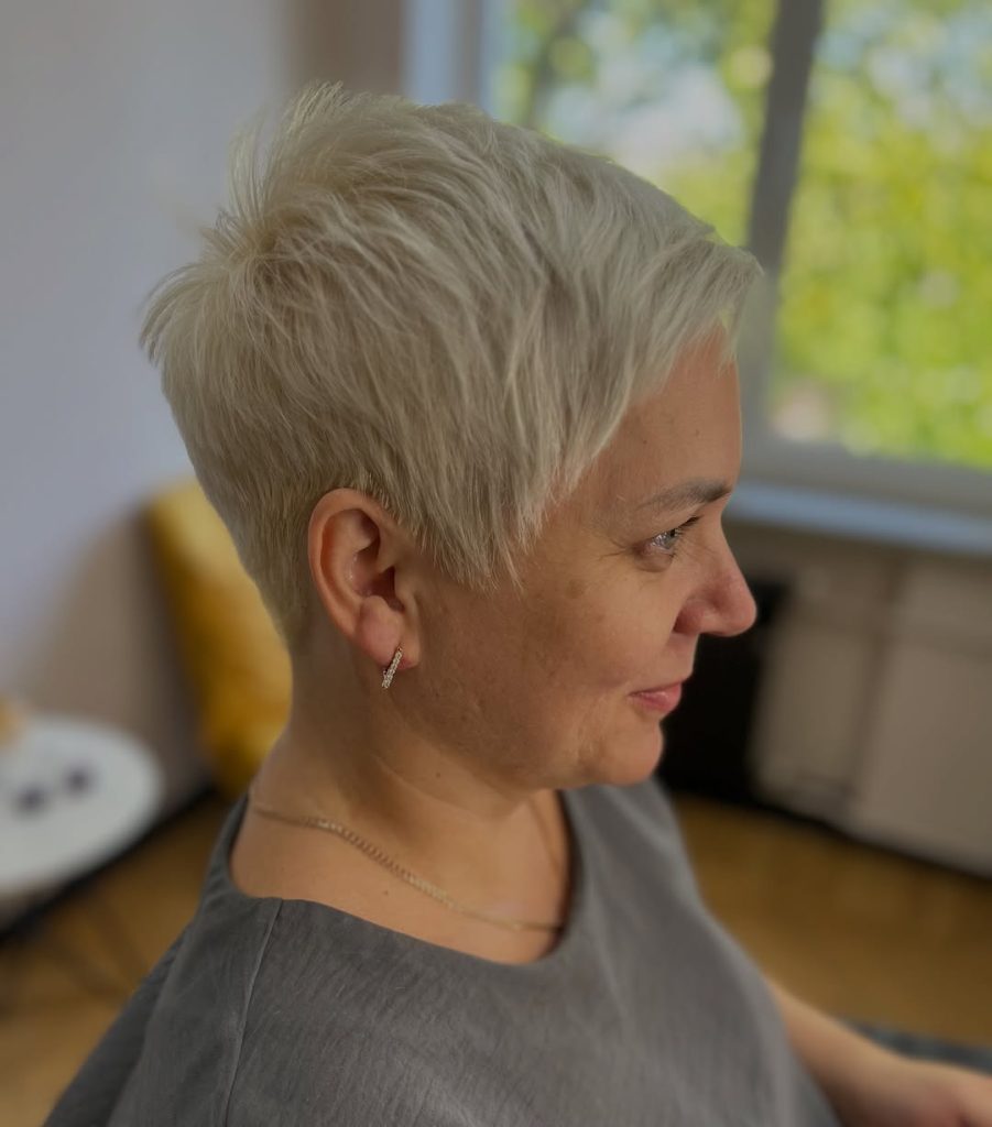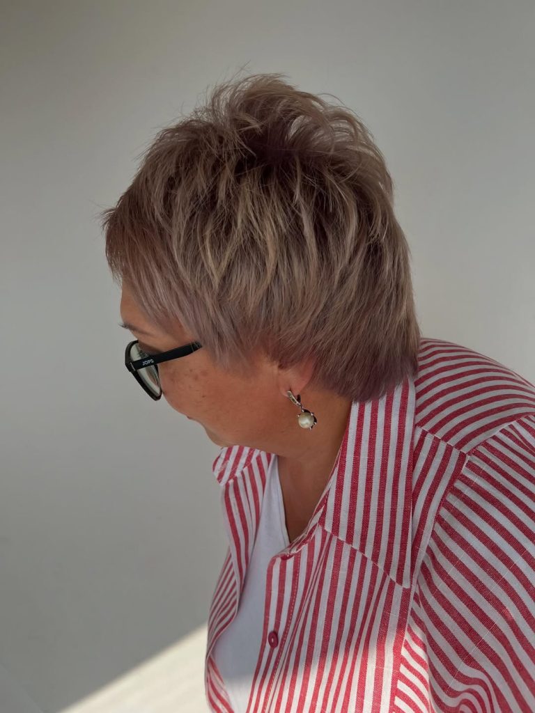 This short pixie with volume has a bold, fresh energy. The lifted crown and tapered sides bring attention to the eyes and cheekbones, creating a youthful, face-lifting effect. It’s a sassy cut that radiates confidence and modern flair — perfect for women ready to make a statement.