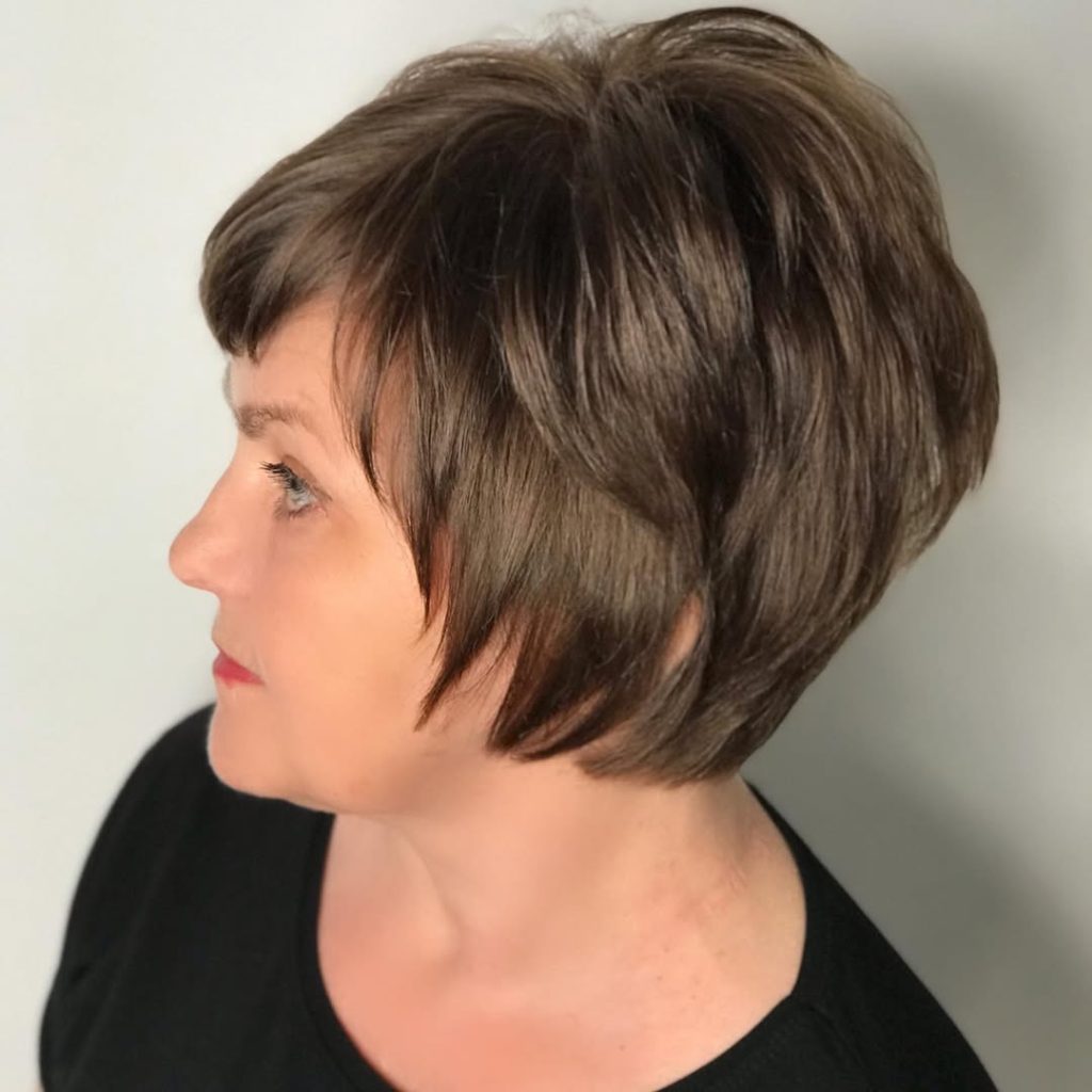 This layered short shag with bangs gives off a playful yet polished vibe. The choppy layers create volume and shape, while the fringe adds softness. It’s a flattering, textured look that works beautifully for women over 50 wanting a stylish refresh.