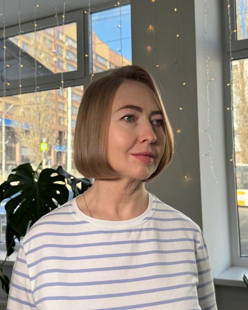 This cut is especially flattering for straight or slightly wavy hair. It’s low maintenance, needing only a light blow-dry to keep its shape. The round structure works well with delicate earrings or a bright lipstick, adding a subtly feminine touch to any outfit.