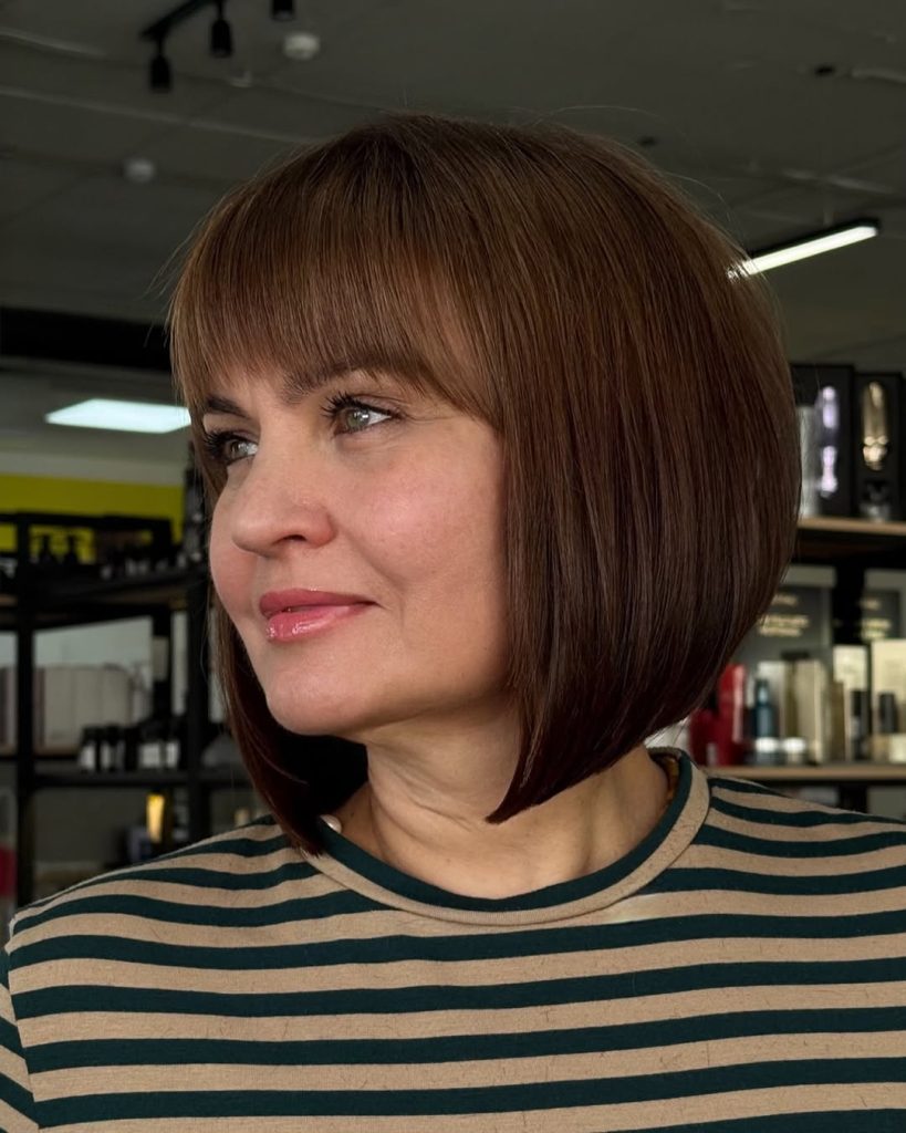 There’s a timeless charm in a sleek angled bob with bangs. The sharp lines and gentle inward curve give it a sophisticated edge, while the fringe softens the look. It’s a beautiful mix of structure and femininity that feels both modern and classic.