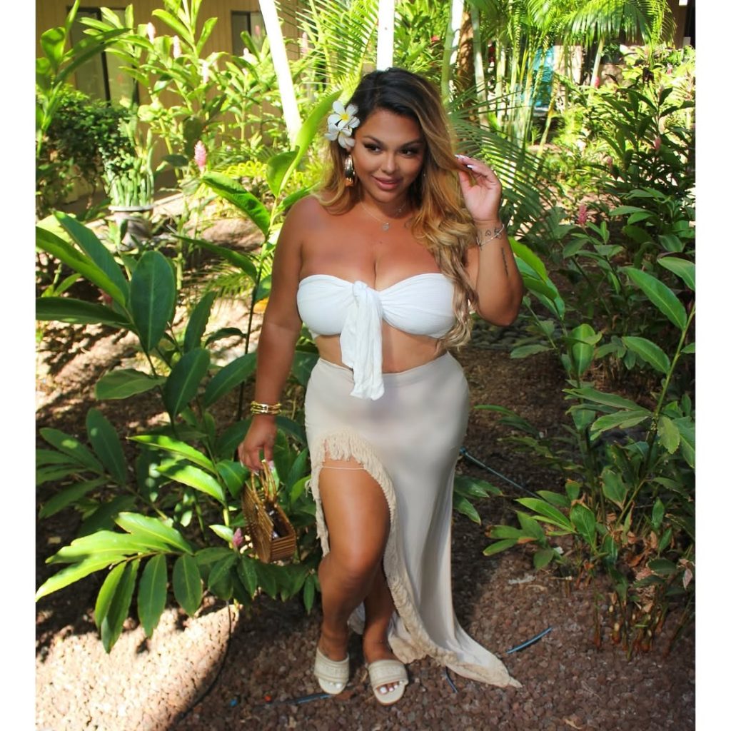 A soft, neutral set with a slit skirt blends girly charm with aesthetic vacation vibes.