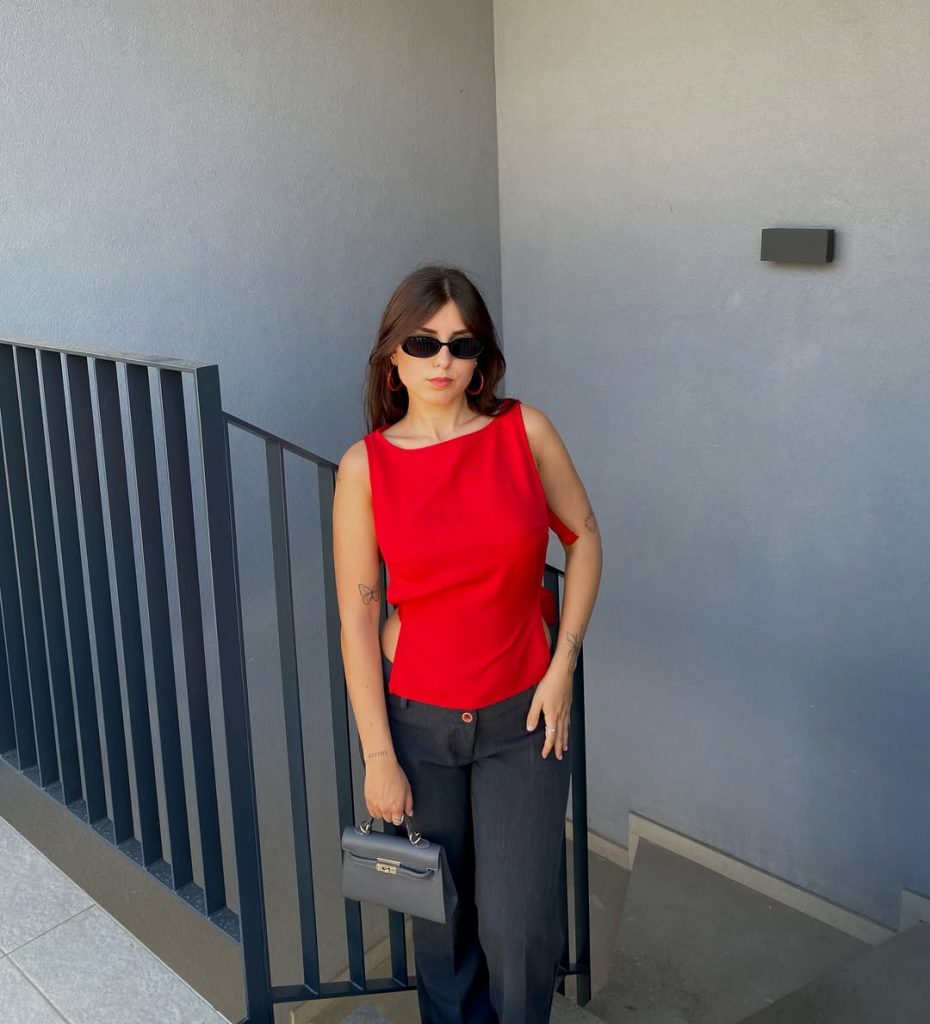A bold red top paired with sleek trousers creates a sharp casual work and Office-ready statement.