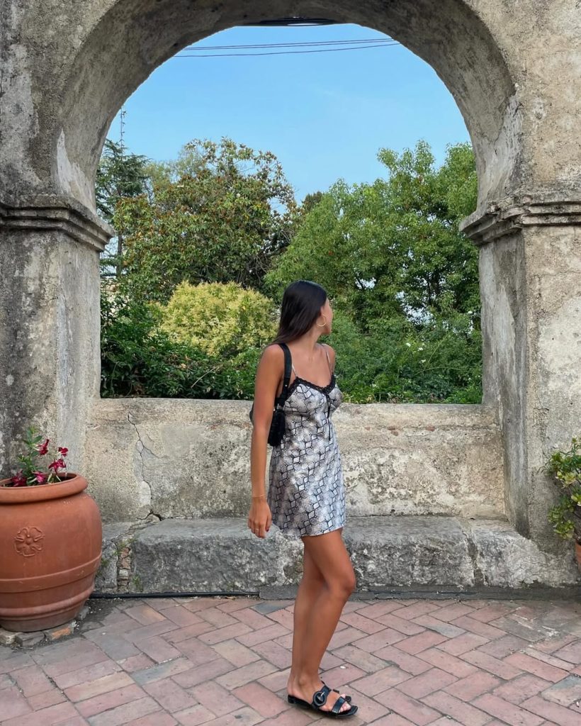 A fitted mini dress with snake print delivers a confident baddie vibe with subtle Y2K influence.