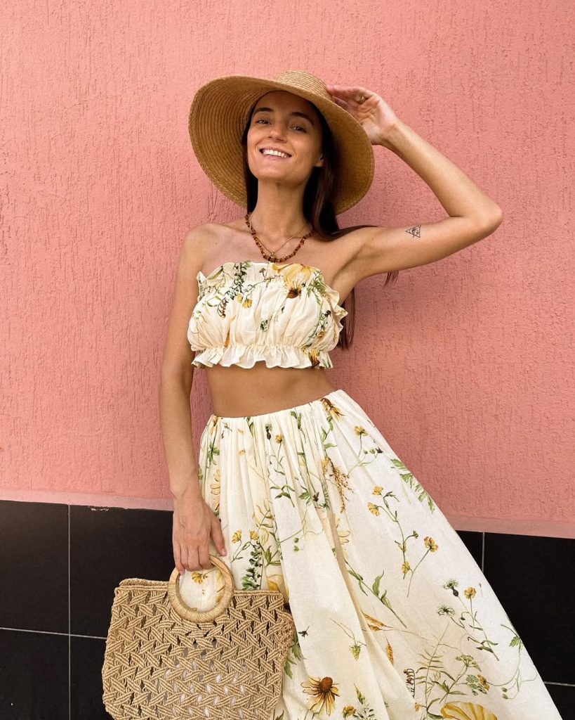 There’s a warmth to this look that feels like a resort morning—easy, glowing, and relaxed. It fits beautifully into 2026 women’s summer wardrobes, especially for travel or beachside dinners. I’d keep the palette neutral and add delicate anklets. Avoid dark accessories—they can disrupt the soft, sun-kissed aesthetic.