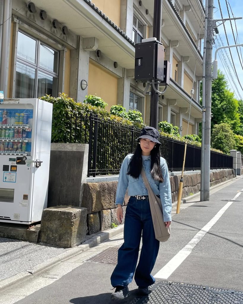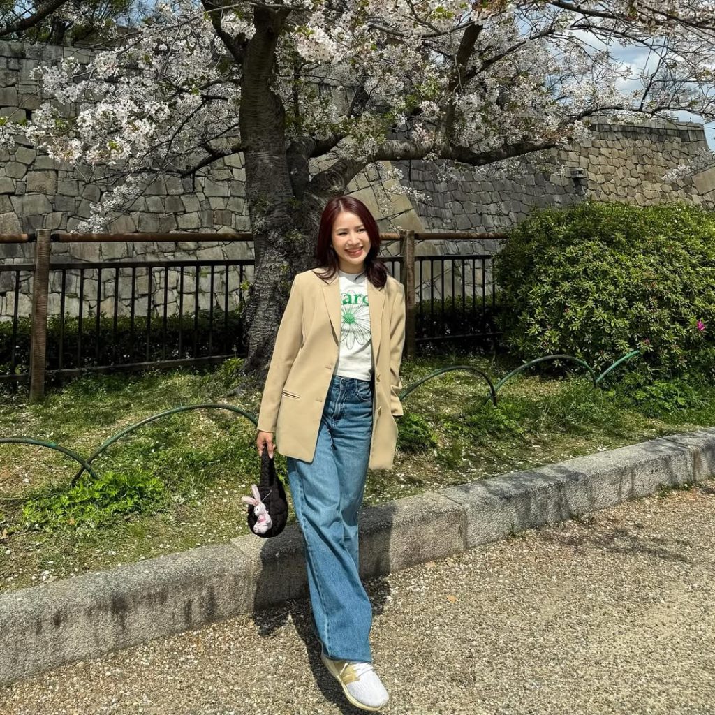 A relaxed spring look blends soft tailoring with casual denim, echoing the calm pace of Tokyo during cherry blossom season. The palette feels gentle, practical, and effortlessly aesthetic.