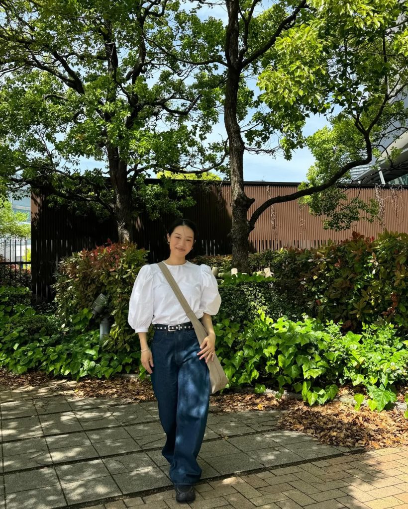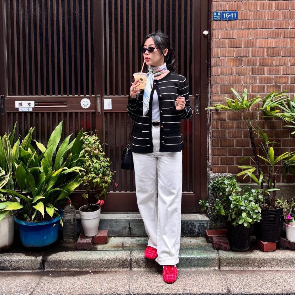 This outfit suits temple visits or slow afternoons in Kyoto during April. Add personality with sculptural earrings or a low bun hairstyle. Avoid bulky backpacks—this look relies on lightness and movement to stay refined.