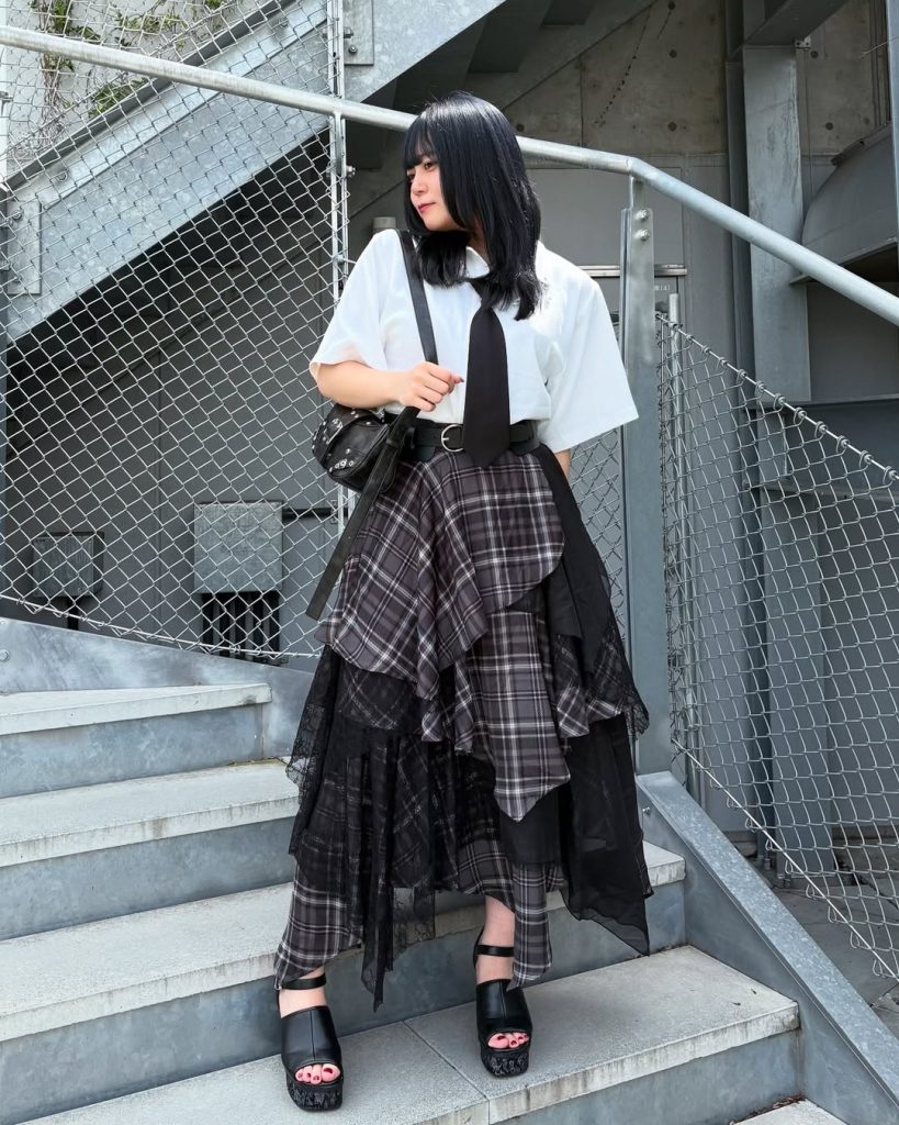 A layered mix of plaid and sheer fabrics brings a contemporary edge to Japanese street style, blending softness with structure.