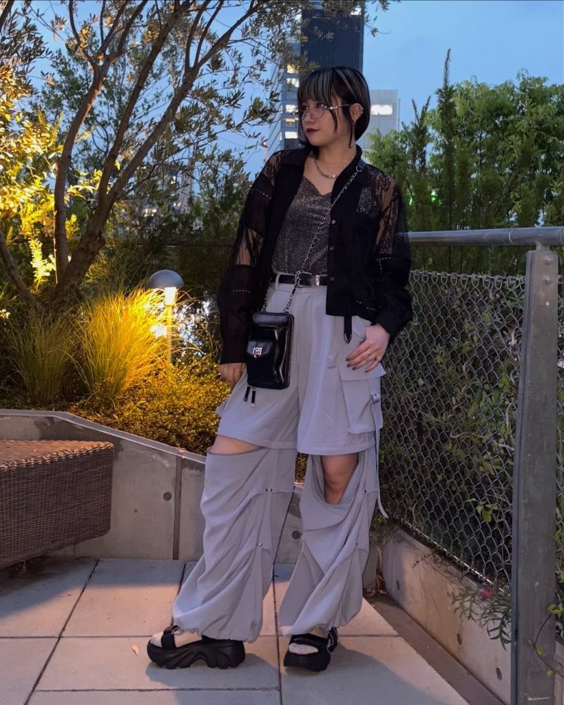 A confident nighttime outfit blends utility elements with sheer layers, reflecting Japan’s bold after-dark street style.