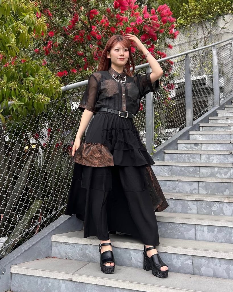 A dramatic black ensemble balances softness and structure, delivering a bold yet wearable aesthetic rooted in Japanese fashion culture.