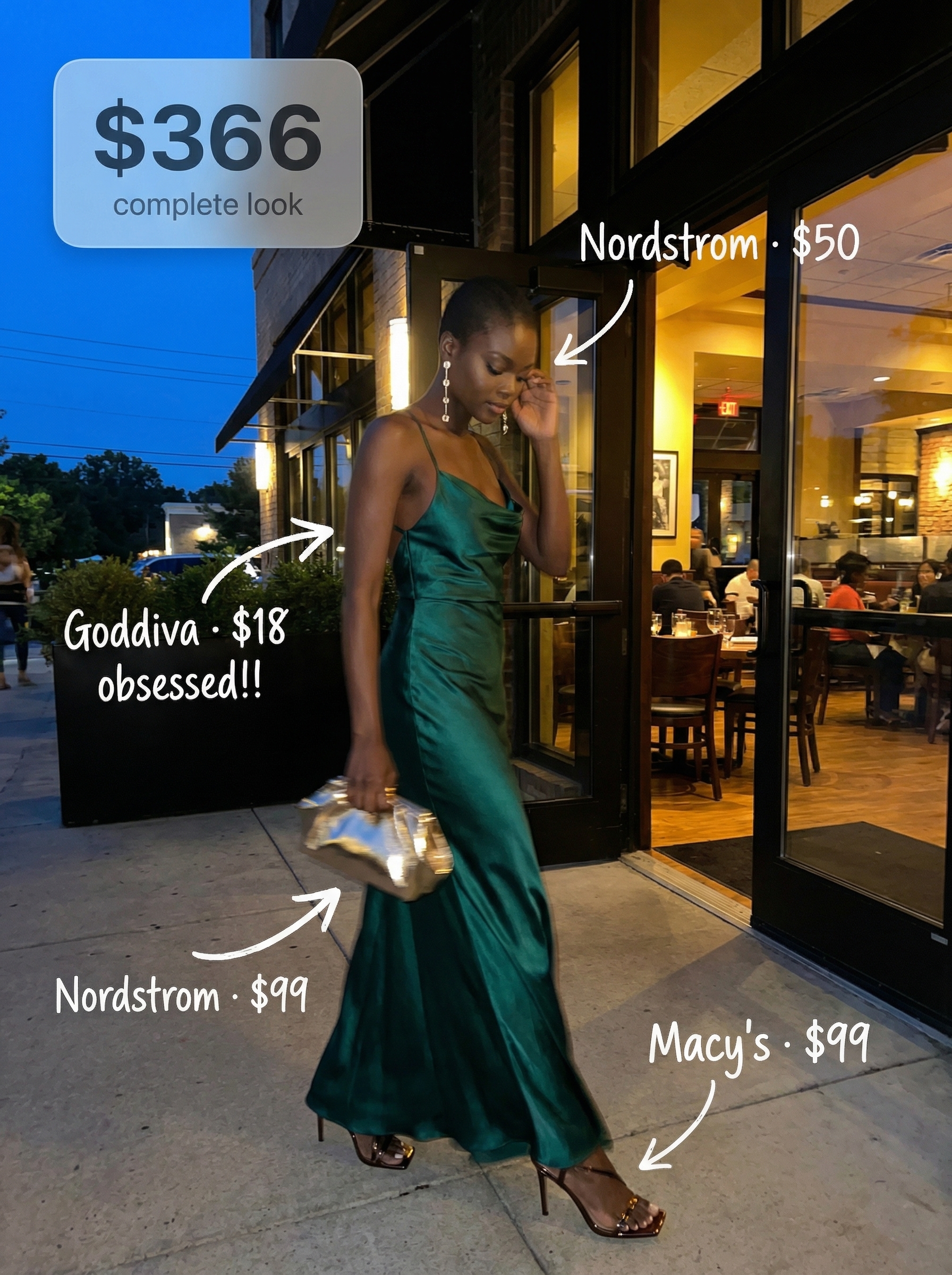 Absolute charmer, this Riviera Glamour look showcases an emerald green satin maxi dress, priced at $18.00, designed with a cowl neck and strappy back made from liquid satin that draped flawlessly without clinging, even after an hour of dancing. This exceptional drape is due to its material, emphasizing a luxurious feel. Complementing this is a pair of $99.00 sandals made of metallic bronze vegan leather, adding a shimmering contrast. This ensemble is perfect for fall outfits; dress to impress, offering a sophisticated and opulent appeal for evening events, with the liquid satin reflecting light beautifully.