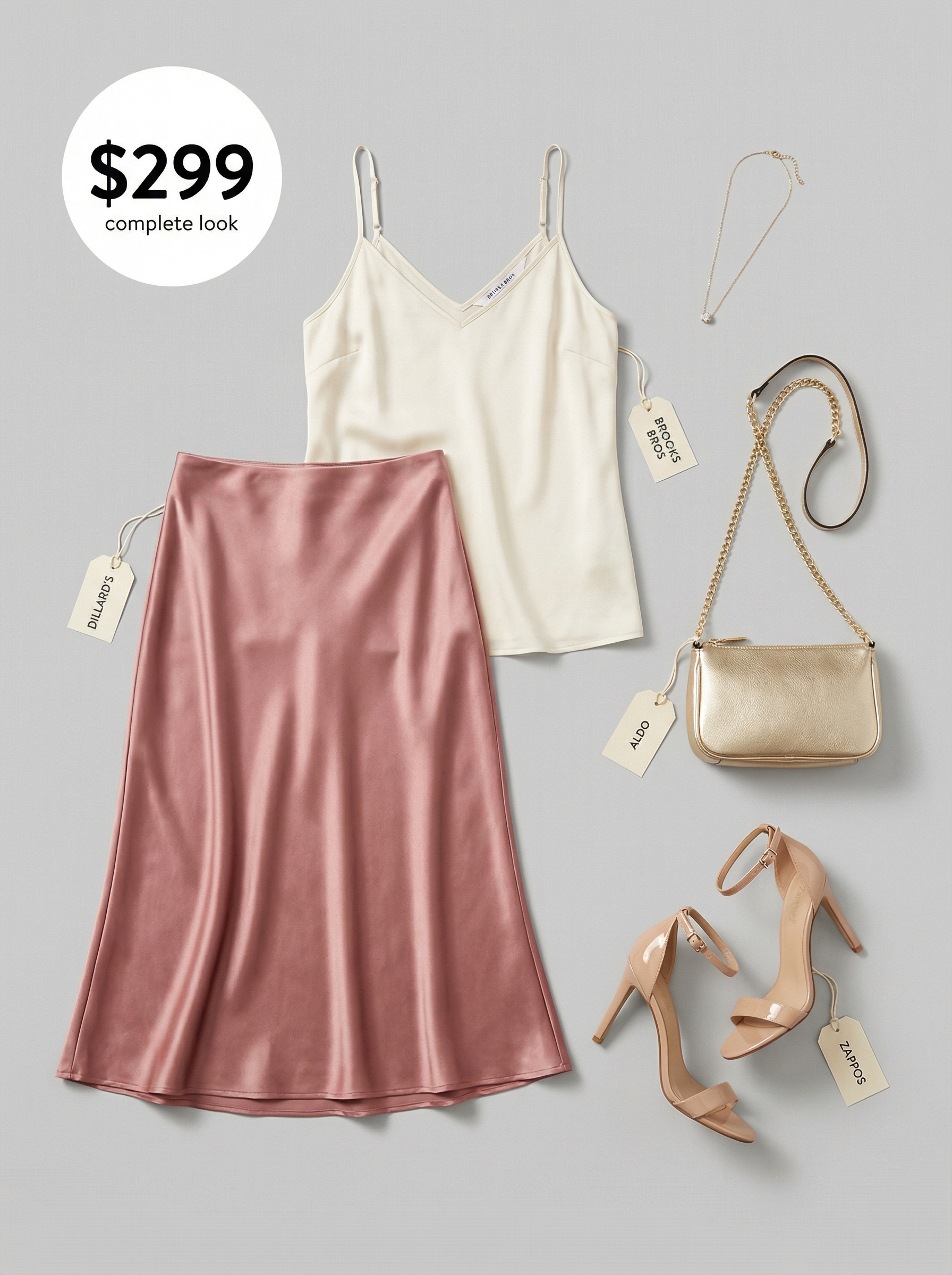 This elegant ensemble features a dusty rose satin bias-cut midi skirt from Dillard’s, originally priced at $51.8, paired with an off-white silk blend V-neck camisole from Brooks Brothers, priced at $103.5, creating a harmonious blend perfect for autumn outfit ideas 2025. The skirt, visually a true dusty rose, is soft and flowing, designed to flatter the figure with its bias cut, maintaining an elegant drape even through a three-course dinner and mingling. The off-white top, a creamy ivory, complements the skirt’s romantic tone, and its silk-blend material suggests a luxurious feel, ideal for formal date nights or as a summer wedding guest, making the total look highly saveable for inspiration.