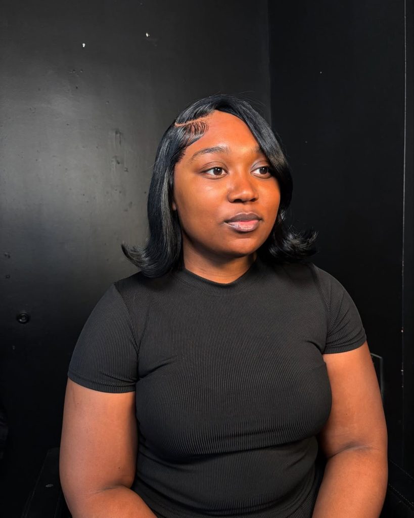 This side-part quick weave is the epitome of grown-woman glamour. Soft curls cascade beautifully without a hitch, achieving a natural bob that’s feminine and chic. A touch of volume inside the root gives it that flawless salon-lifted finish, while perfectly framed baby hairs shape up your face. Ideal for medium to thick hair textures, this cut looks fantastic on those seeking a ready-for-a-night-out-but-still-feels-opulent hairstyle.