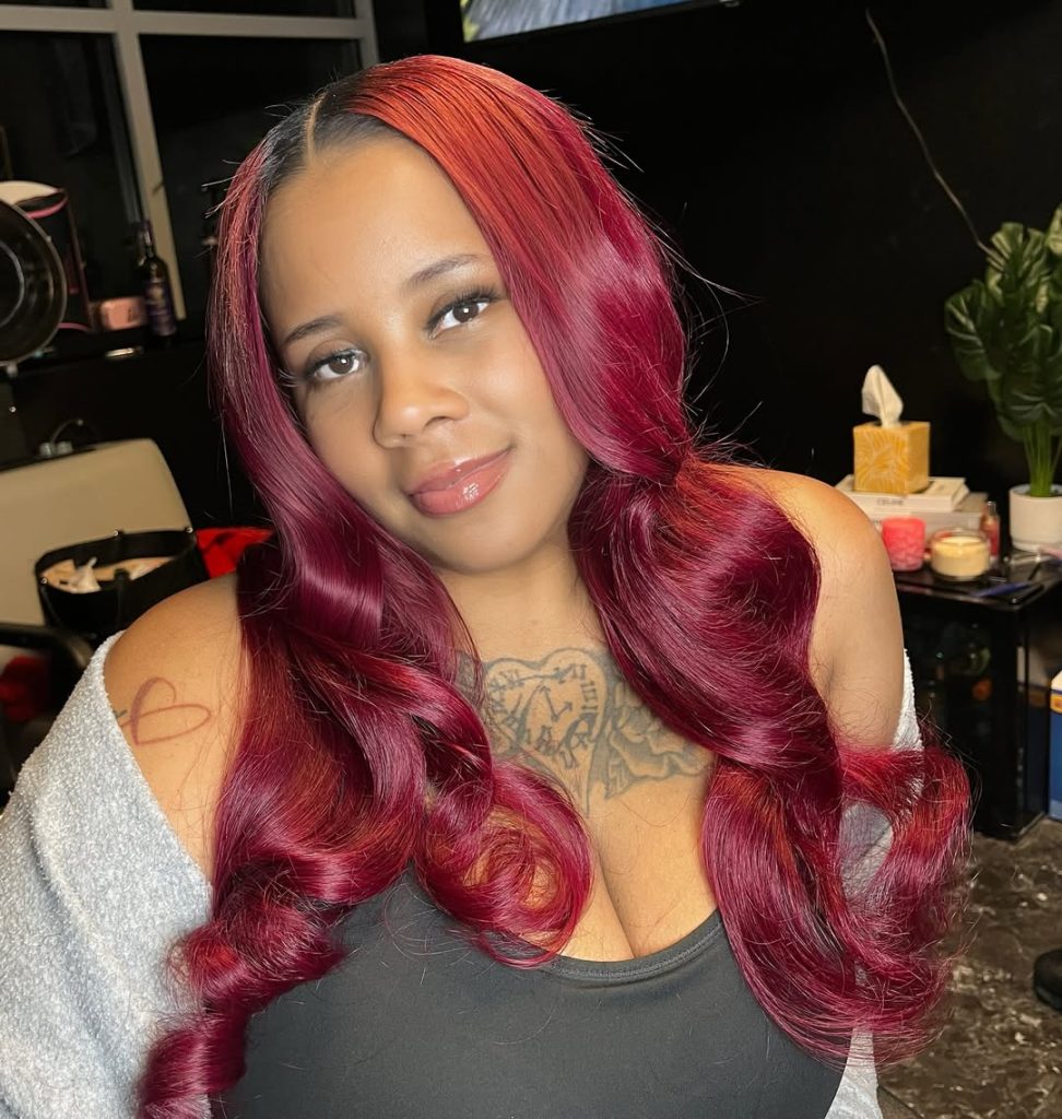This style is a great match for women who love experimenting with color but still want something elegant. The burgundy hue works well on warm and neutral undertones, and the big body wave styling gives the hair a glamorous finish. It’s a quick-weave statement that doesn’t need much else—just confidence and a smile.