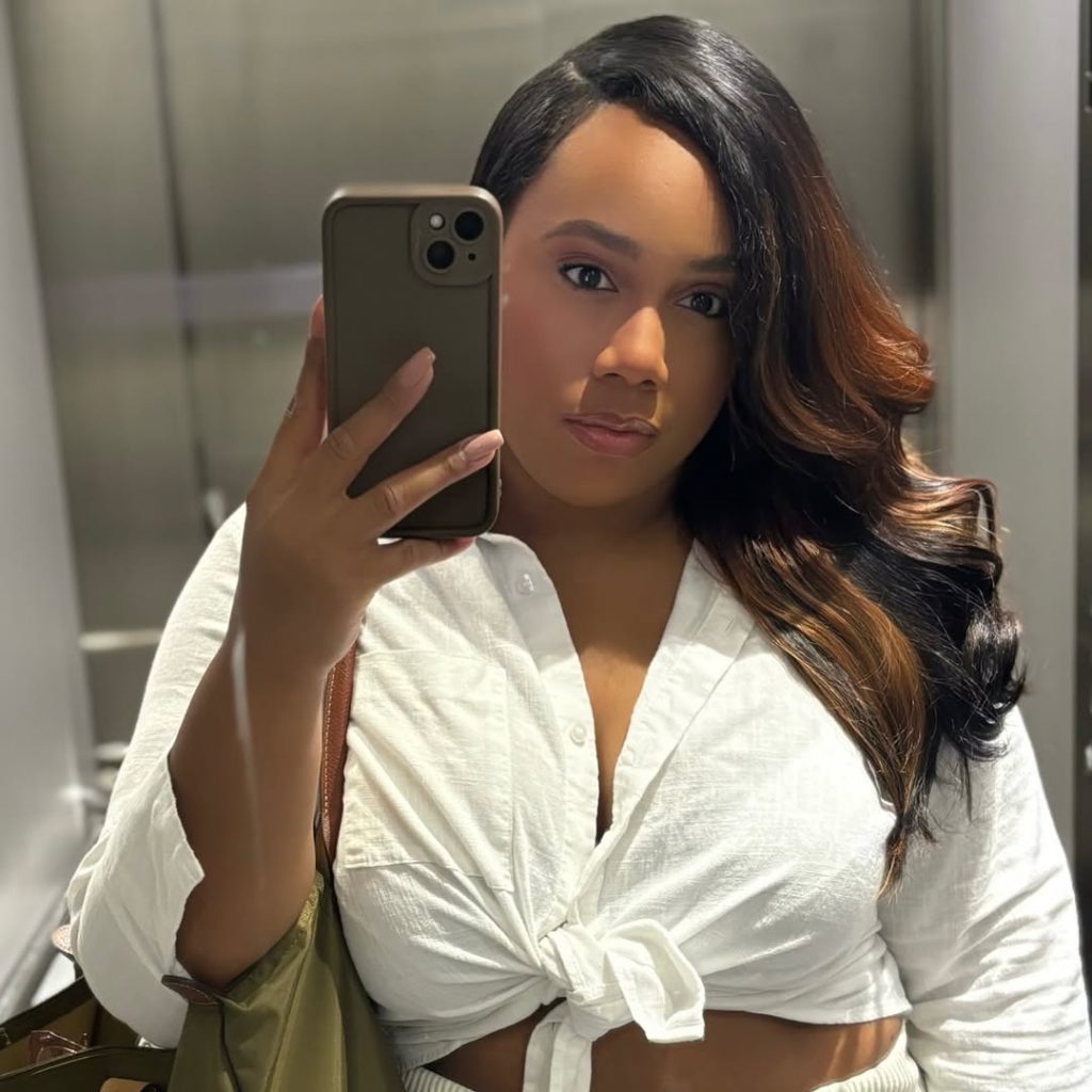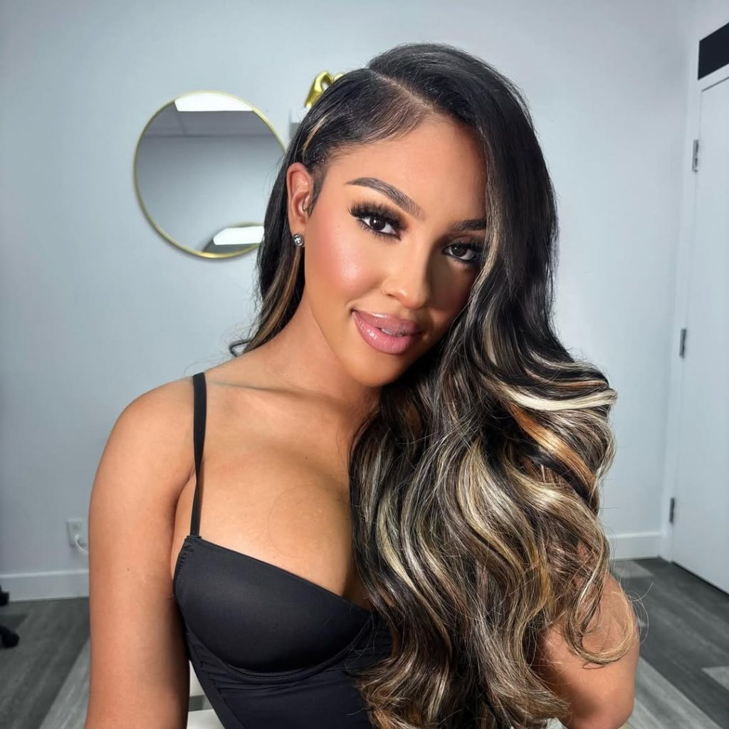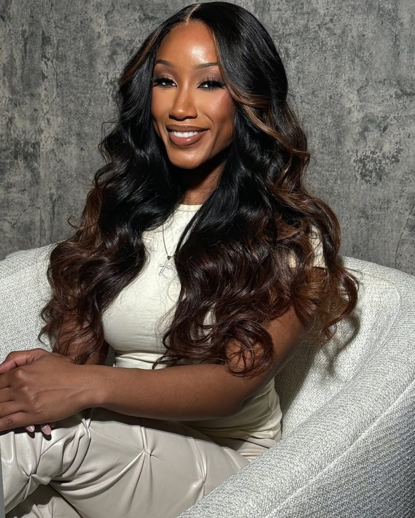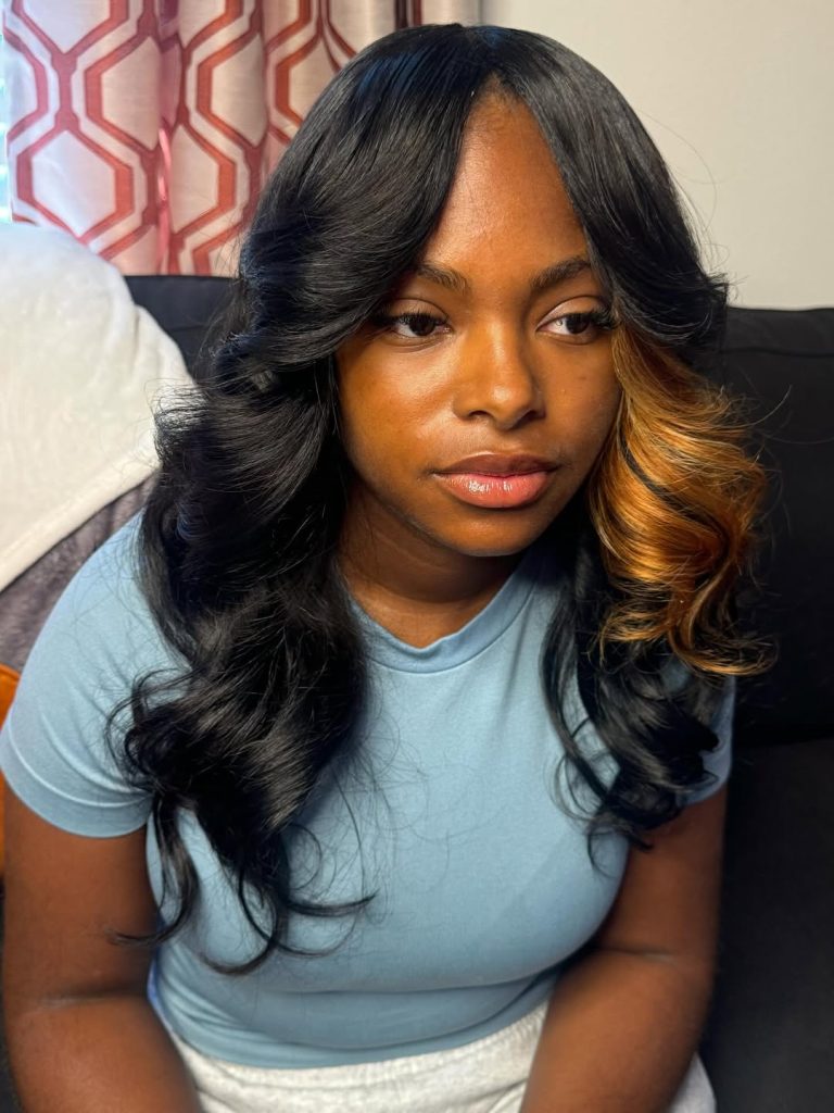 Soft waves paired with a deep side part create a timeless, feminine look. The warm brown and caramel highlights running through the black base add richness and glow, giving this quick weave a sun-kissed effect that feels perfect year-round. It’s elegant but not fussy, effortlessly chic with just the right amount of glam.