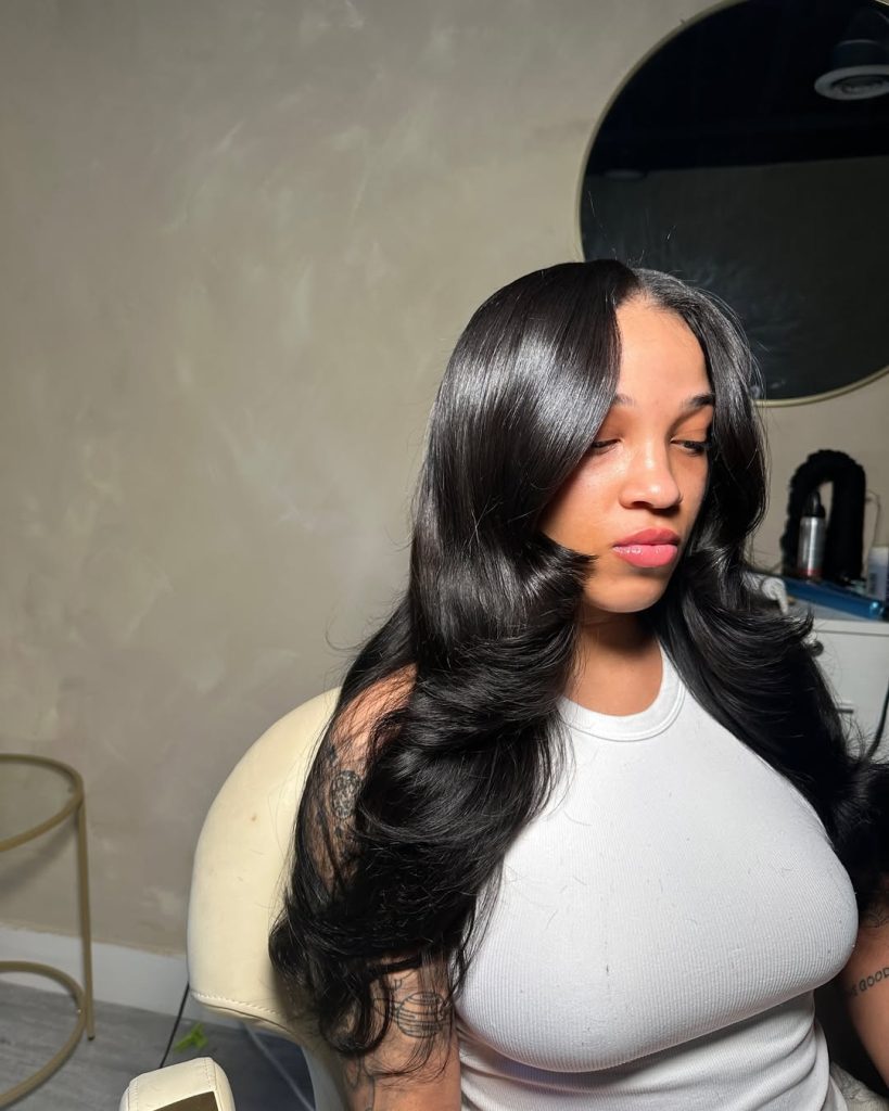 This middle part quick weave is all about soft power—polished, confident, and timeless. The gentle layers add movement, while the deep luster creates that “fresh salon” glow. It’s understated but impossible to ignore, the kind of look that pairs perfectly with glossy lips and gold hoops.