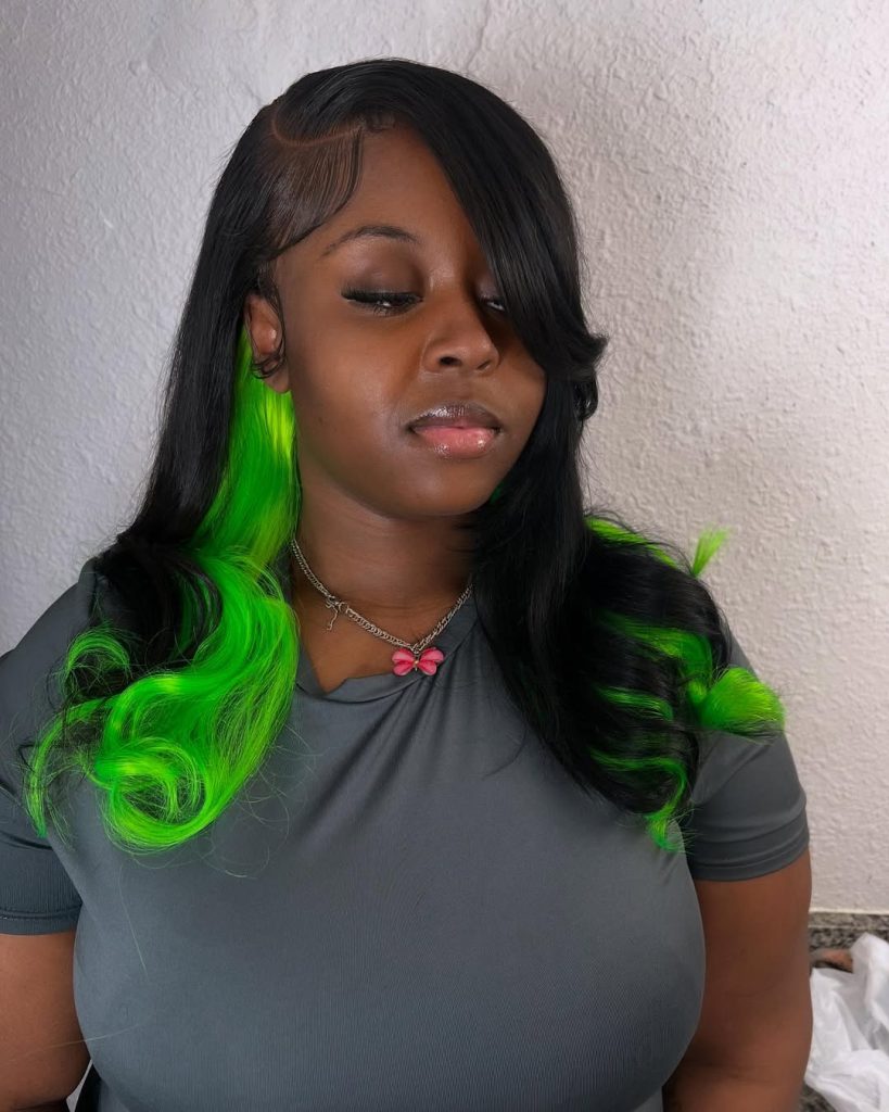 When you want to make a statement without saying a word, this bold black and neon green quick weave says it all without you having to say a thing. The bright streaks add a fun spirit to the shiny black foundation that shows confidence doesn’t mean you can’t be loud. It’s fun, it’s sassy, it’s lively—a definite head-turner for 2026.