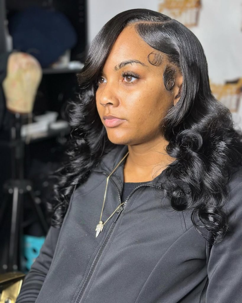 Sleek roots and flowing deep wavelengths make this quick weave pure magic. The texture dances between soft and sultry, giving off a “put-together but carefree” energy. It’s one of those styles that makes even a simple outfit feel intentional—the perfect harmony of polish and personality.