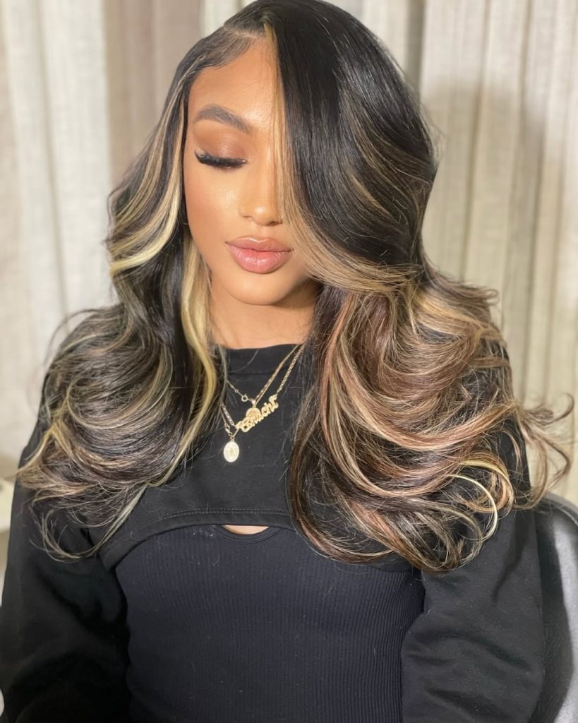 There is nothing that spells “flirty and fresh” as much as a dramatic part on the side with blonde highlights swept through dark hair. This is a hairstyle that brightens up your face in a snap even as it adds dimension for that glamorous yet friendly finish. The long body wave curls cascade beautifully with no fuss so that you are left with a lovely romantic flow that is ideal for date night as well as special events.