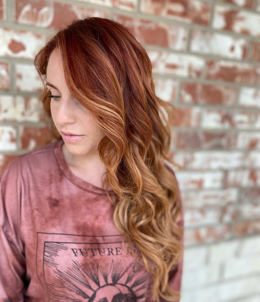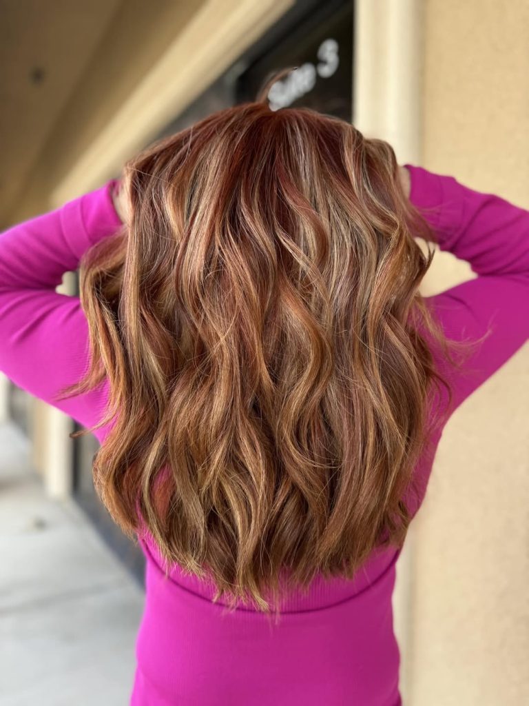 The richness of auburn paired with caramel blonde dimension makes this hairstyle feel full of life. The long waves bounce with shine, and the blend of shades creates an almost glowing effect. It’s romantic, stylish, and just a little bit glamorous.