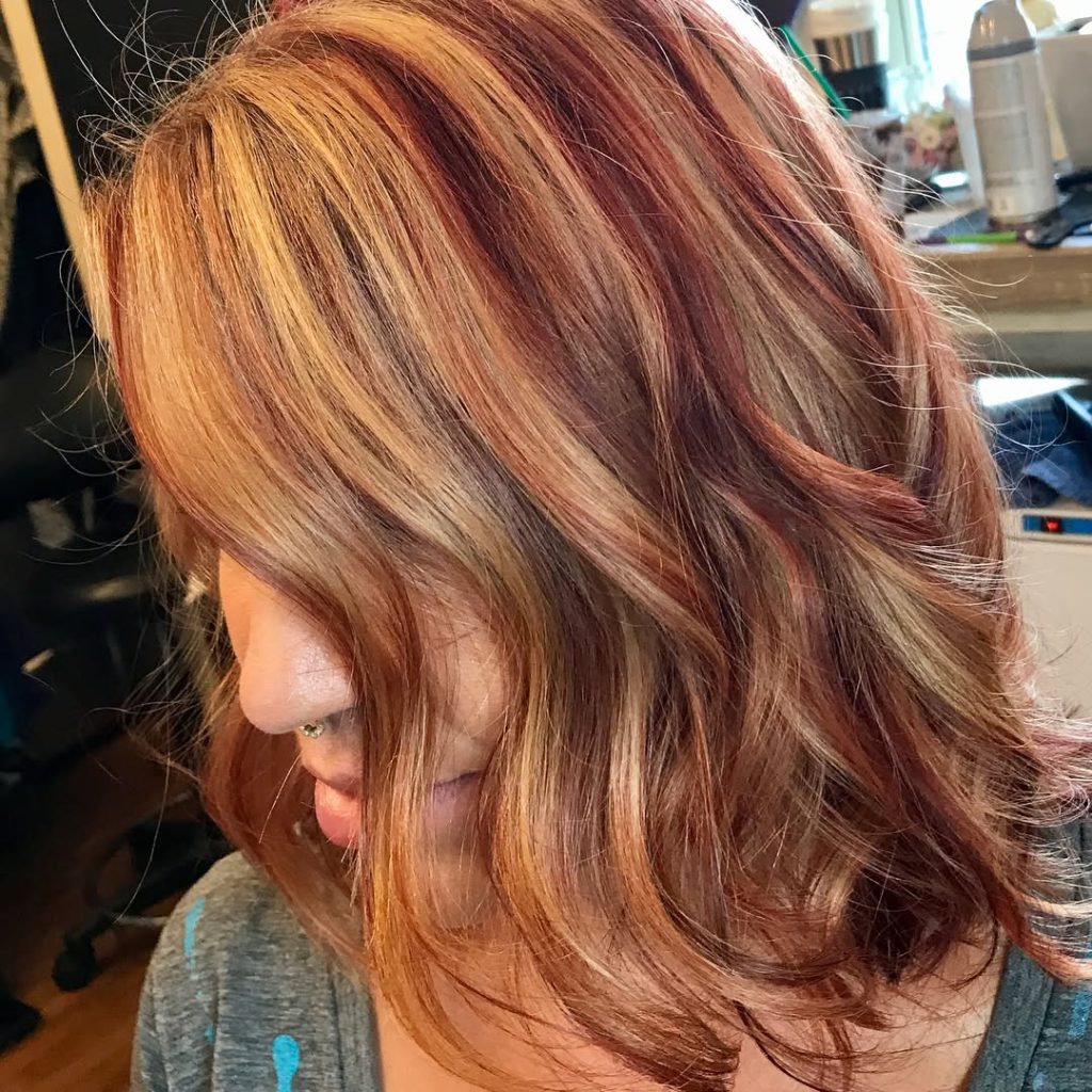 16. Multi-Tonal Red with Caramel and Blonde Strands