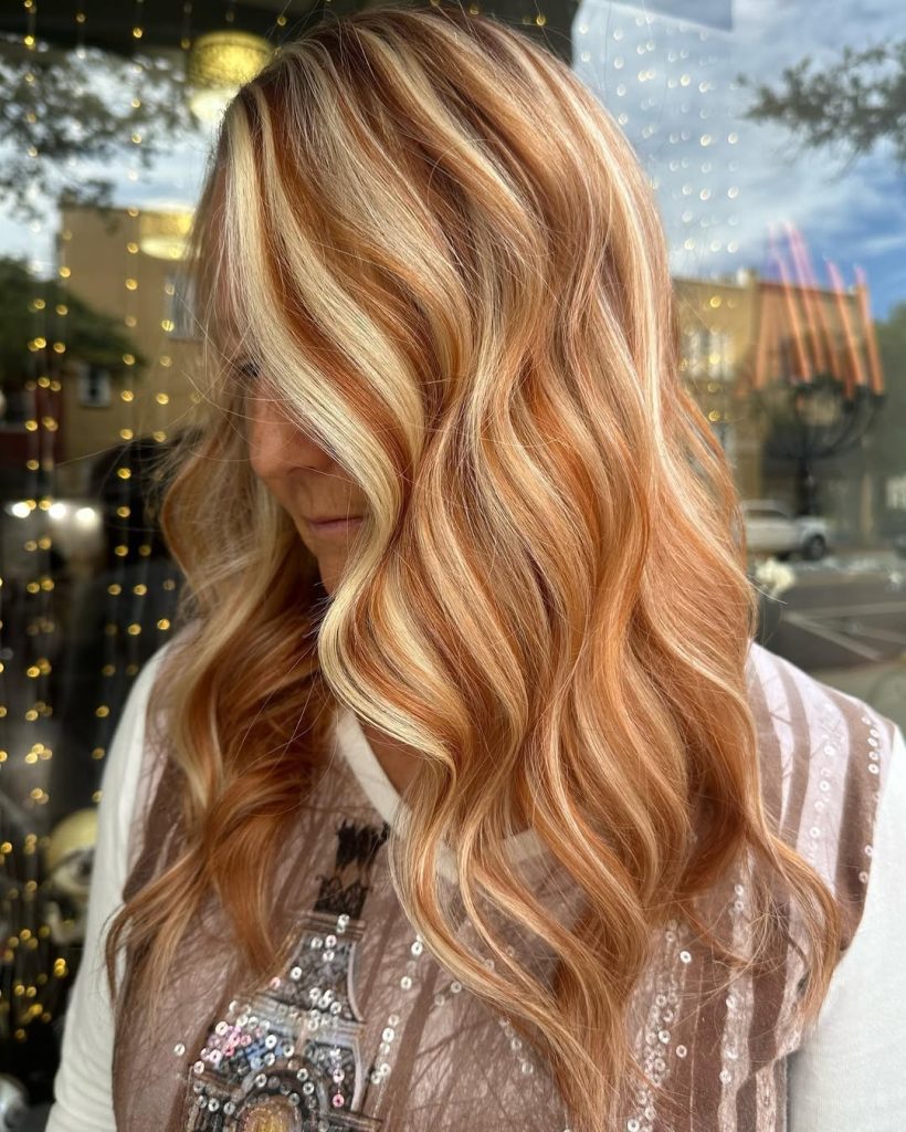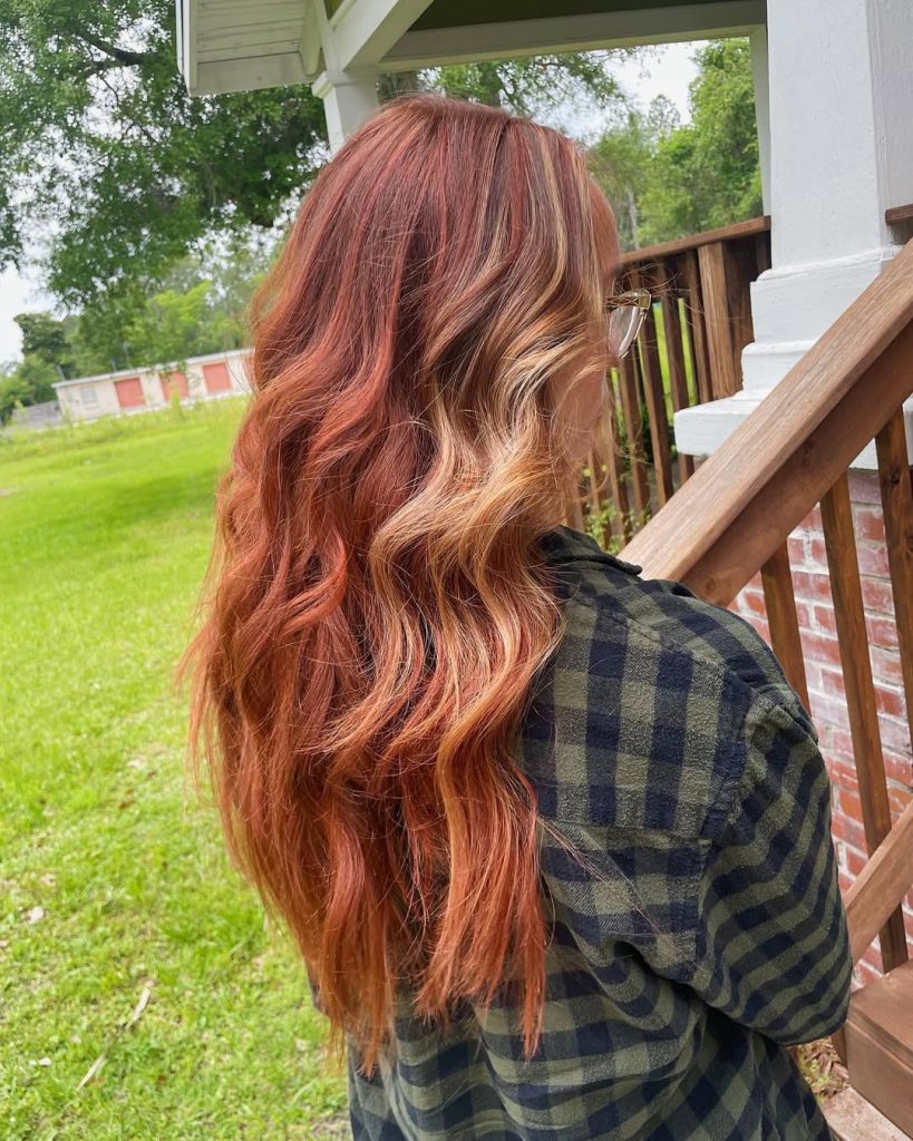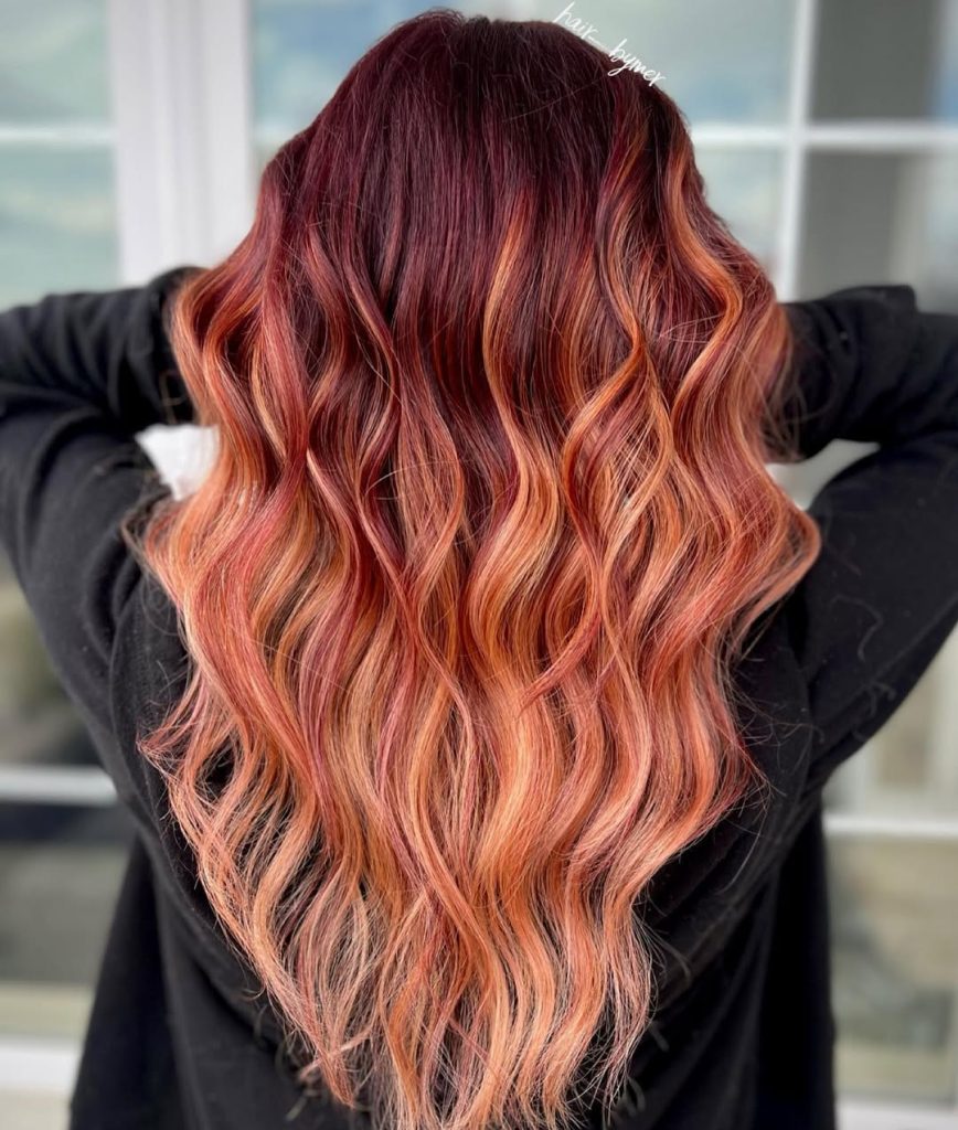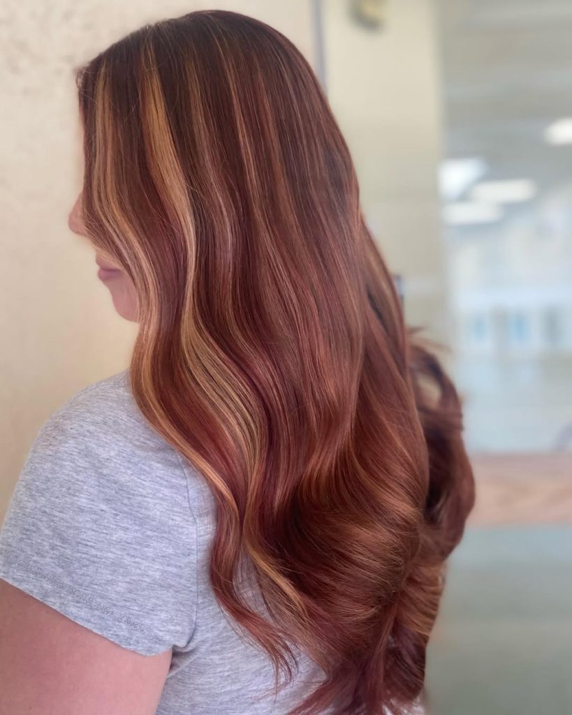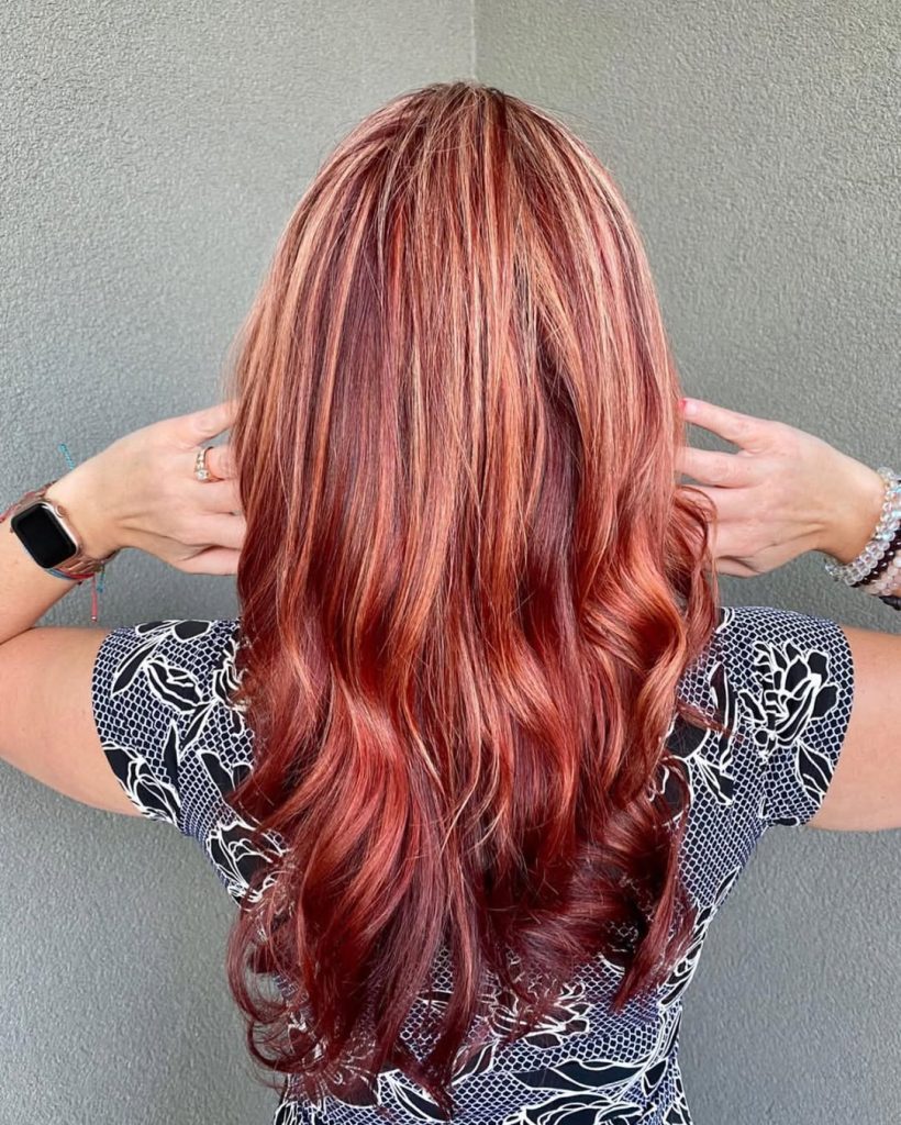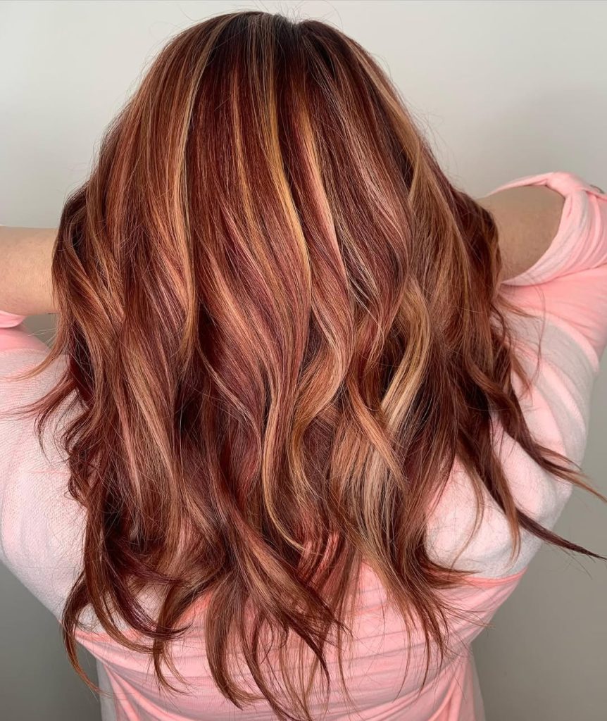 This look resembles a warm autumn afternoon bottled into a hair color. The deep-red base has a soft-coppery glow, while the golden-blond highlights swirl through the waves like sunlight slipping between leaves. It’s playful but also elegant, so it never becomes a style that feels overdone. The dimension gives life to each strand, and it’s one of those hair colors that seem to change according to the light that surrounds you.