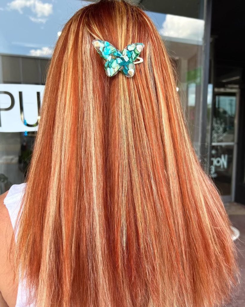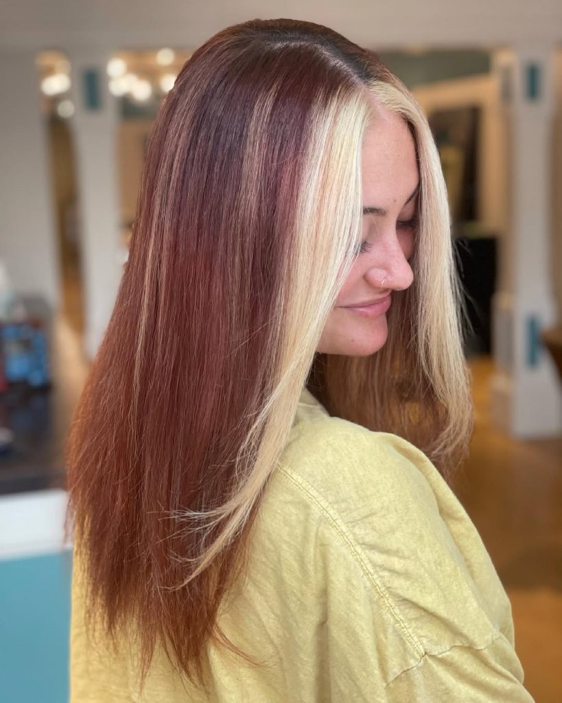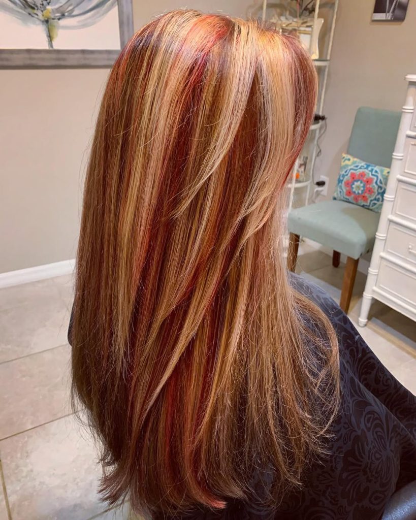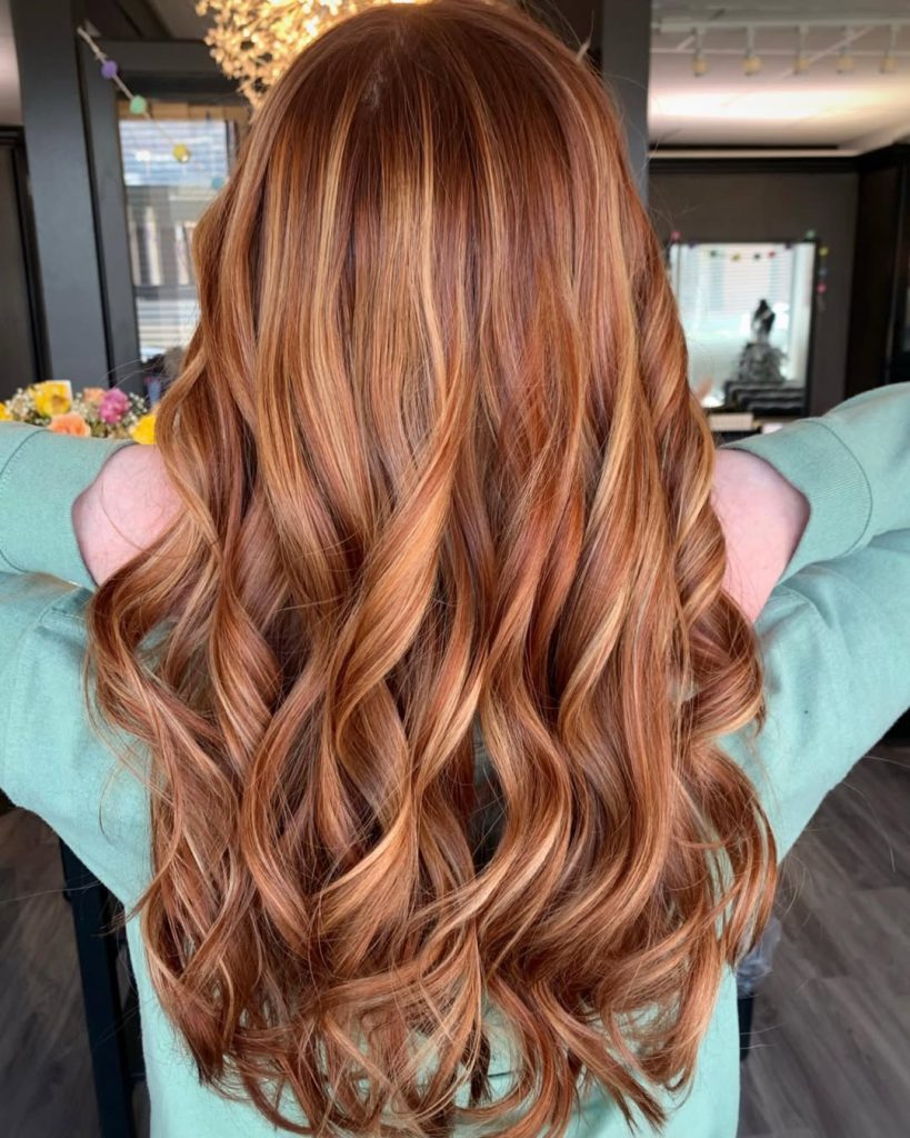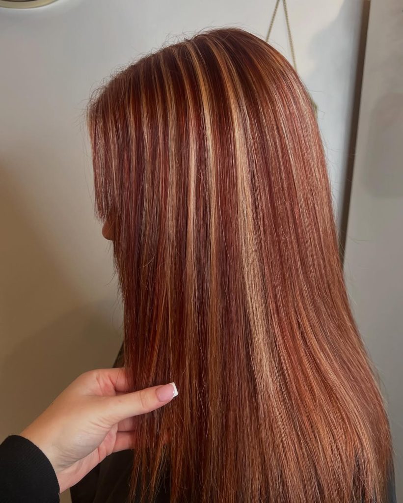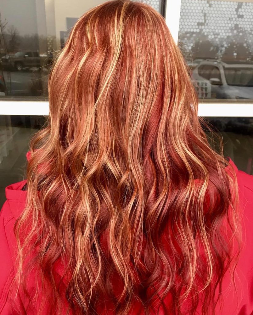 This look resembles a warm autumn afternoon bottled into a hair color. The deep-red base has a soft-coppery glow, while the golden-blond highlights swirl through the waves like sunlight slipping between leaves. It’s playful but also elegant, so it never becomes a style that feels overdone. The dimension gives life to each strand, and it’s one of those hair colors that seem to change according to the light that surrounds you.