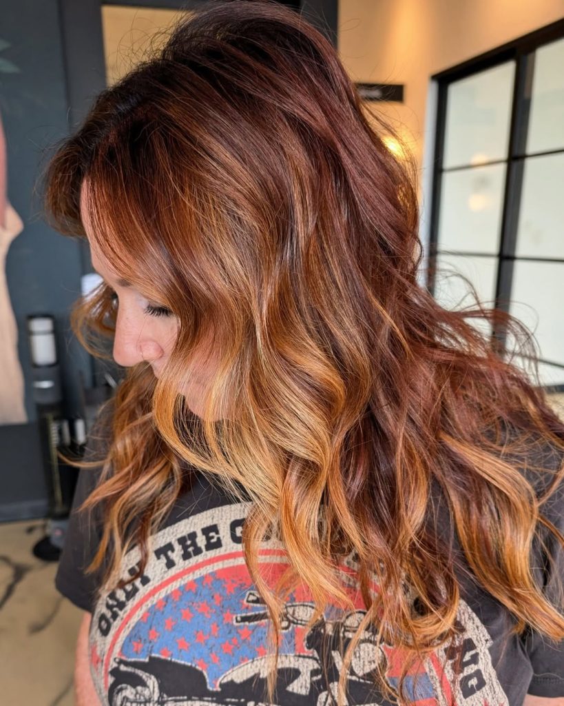 This look has a sultry, slightly undone energy. The dark auburn base flows into honey blonde balayage, creating a smooth transition that feels trendy and effortless. It’s relaxed yet chic, and the warm tones work together in harmony.